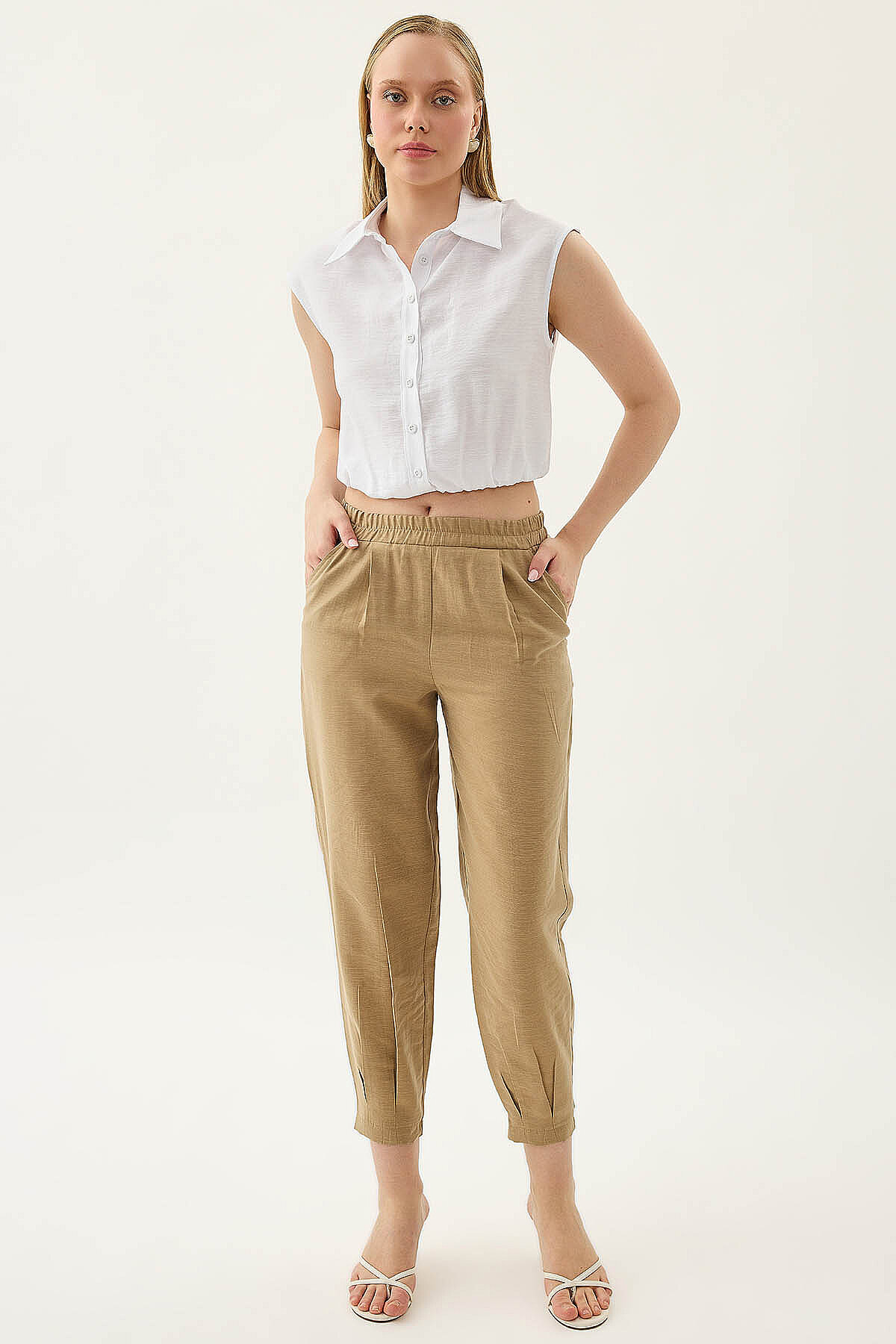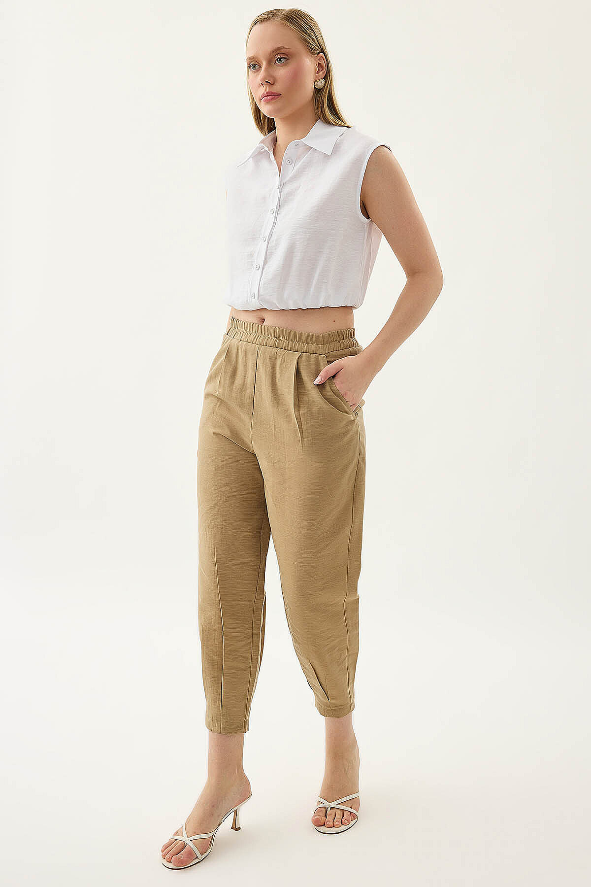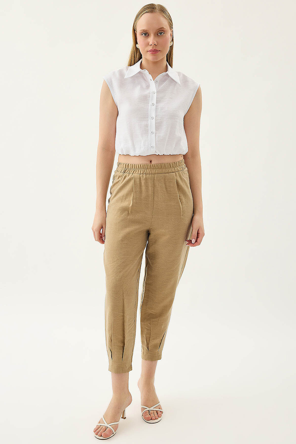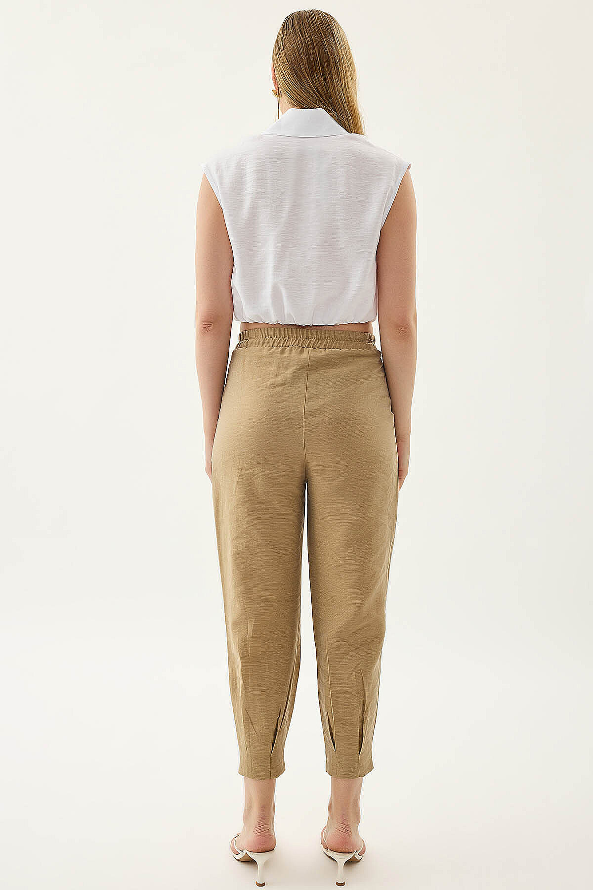 Paçası Pileli Beli Lastikli Pantolon Krem