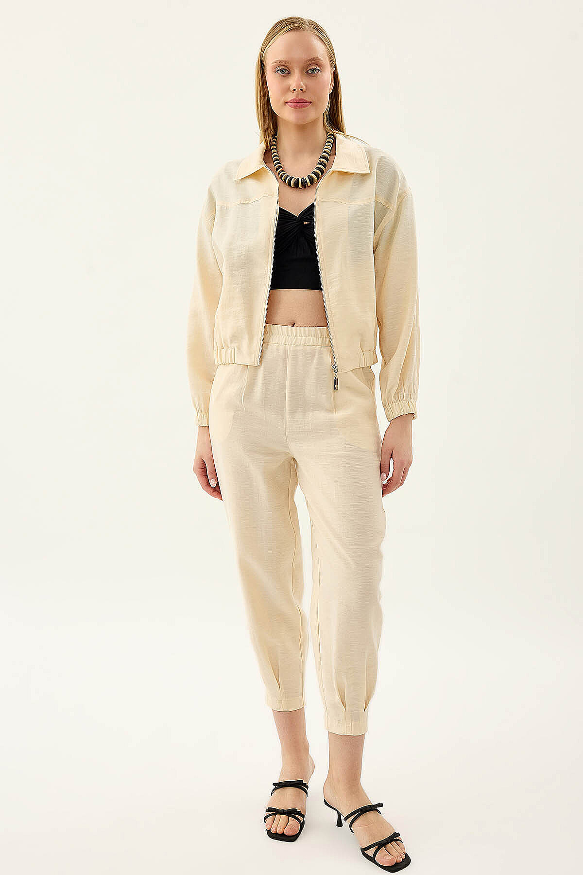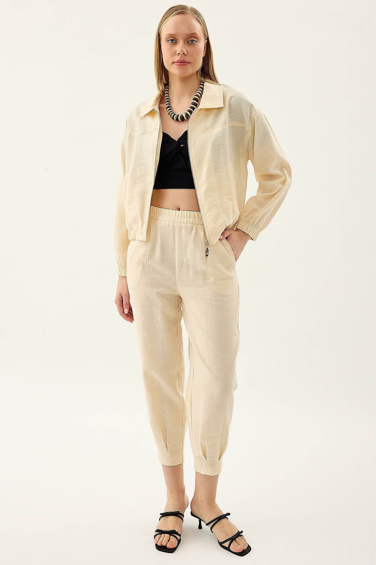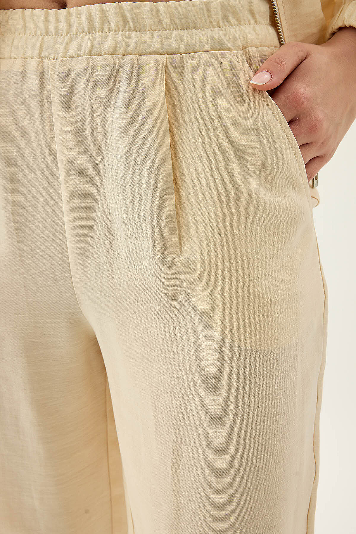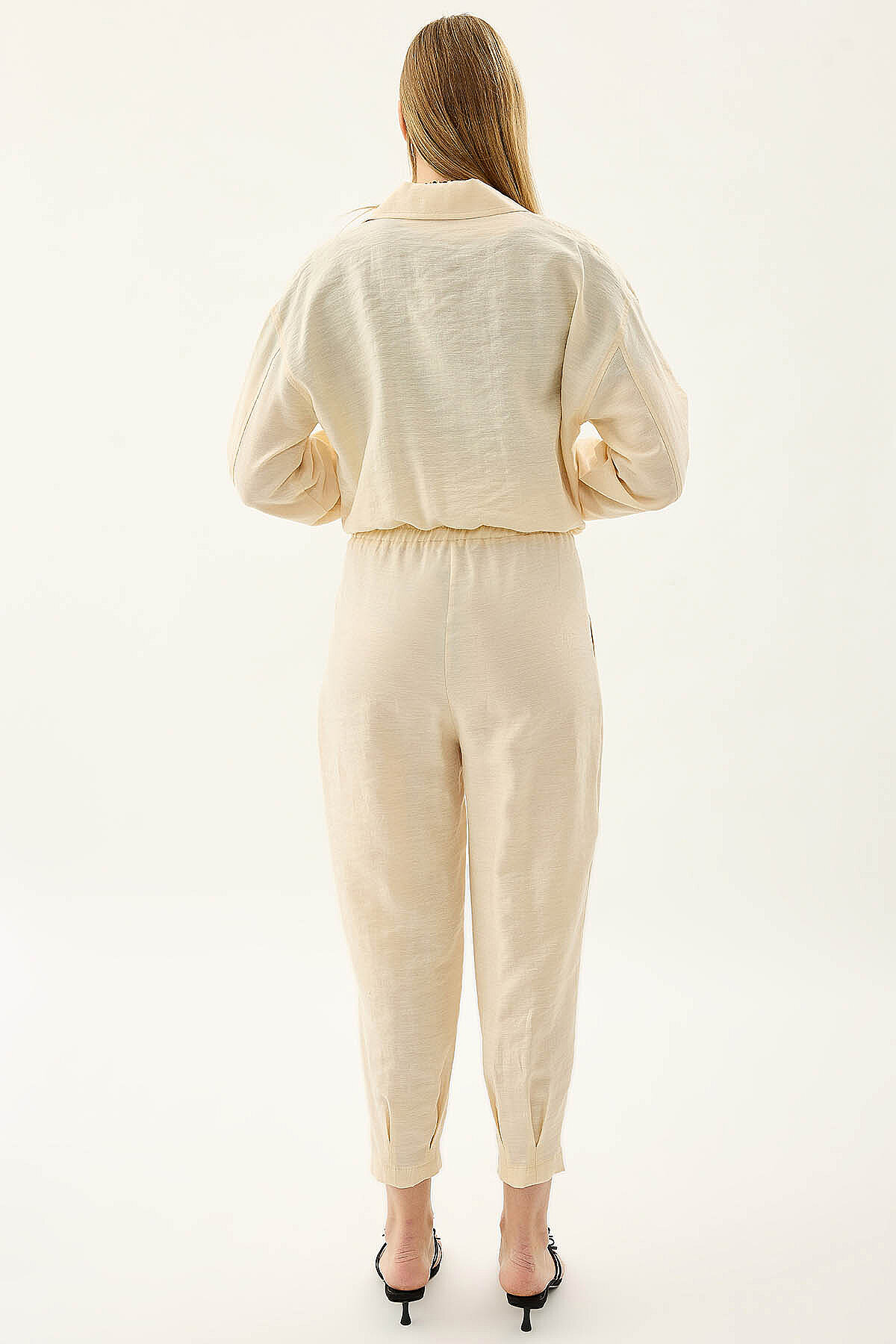 Paçası Pileli Beli Lastikli Pantolon Krem