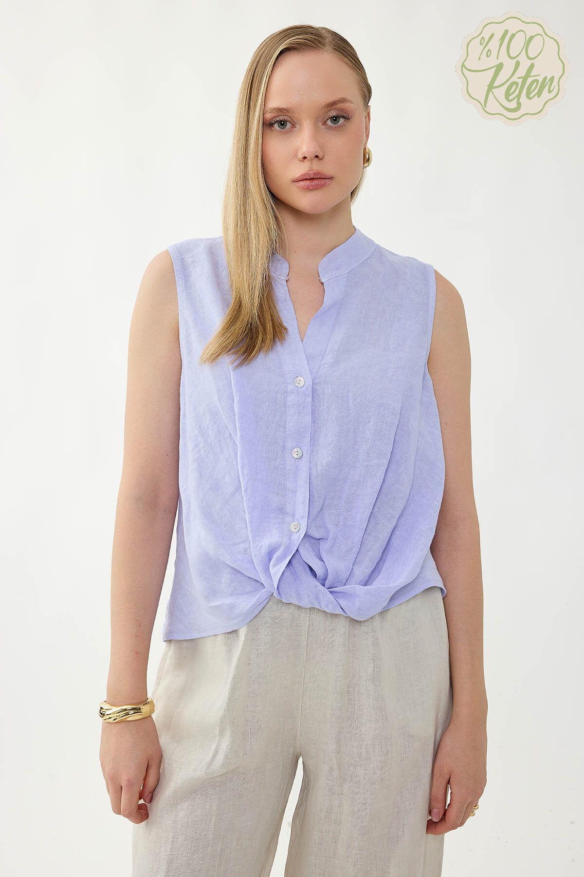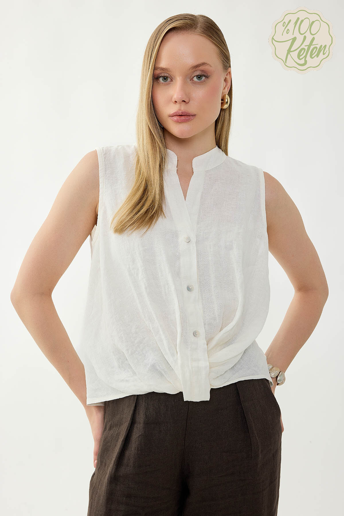 %100 Keten Sedef Düğme Önü Büzgülü Bluz