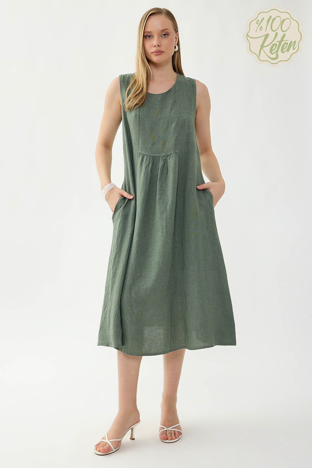 %100 Keten Sıfır Kol Cepli Elbise Haki