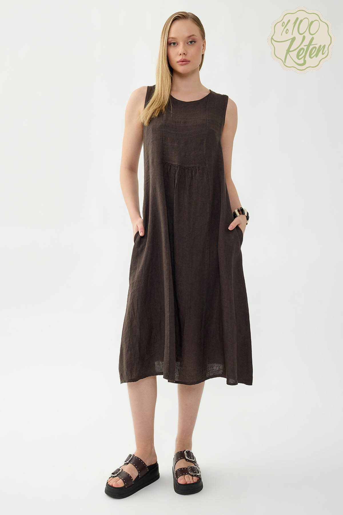%100 Keten Sıfır Kol Cepli Elbise Kahve