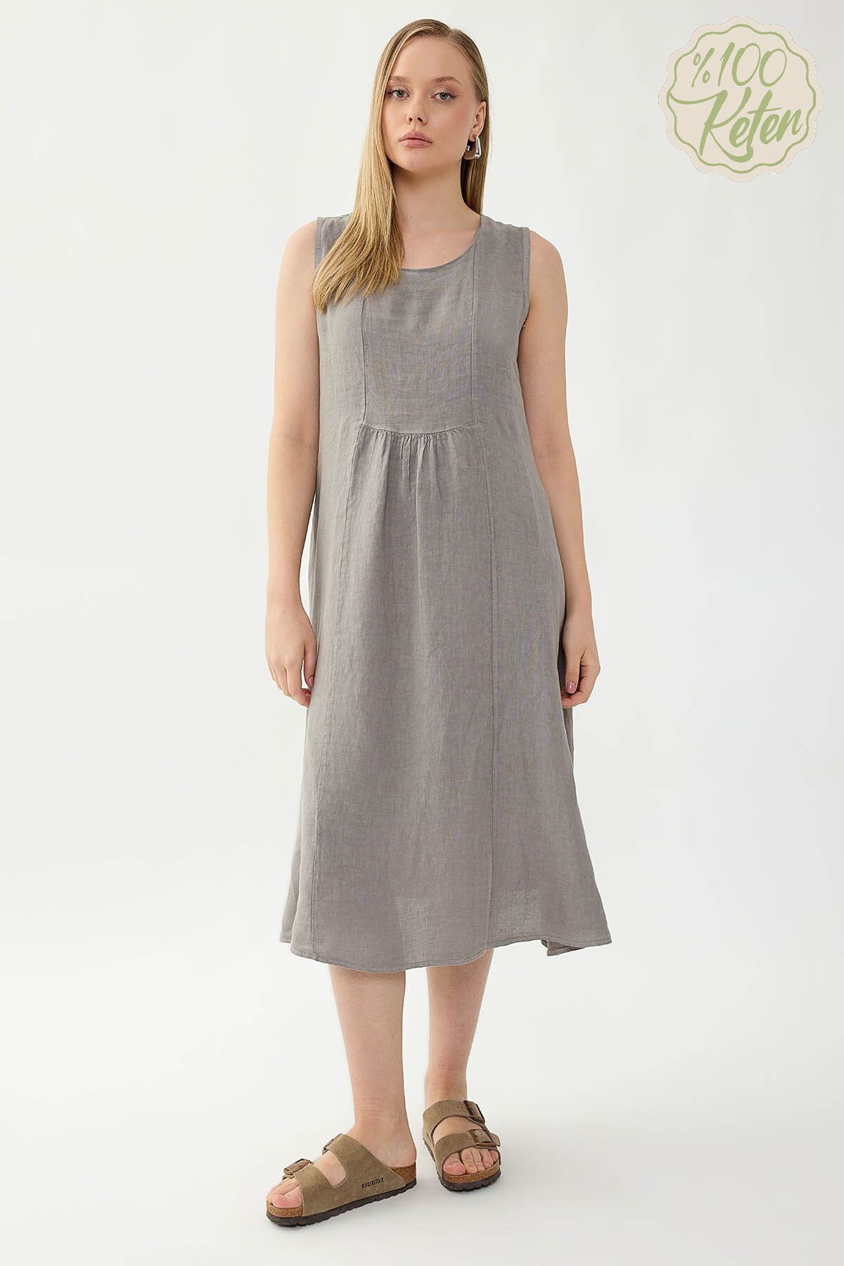 %100 Keten Sıfır Kol Cepli Elbise