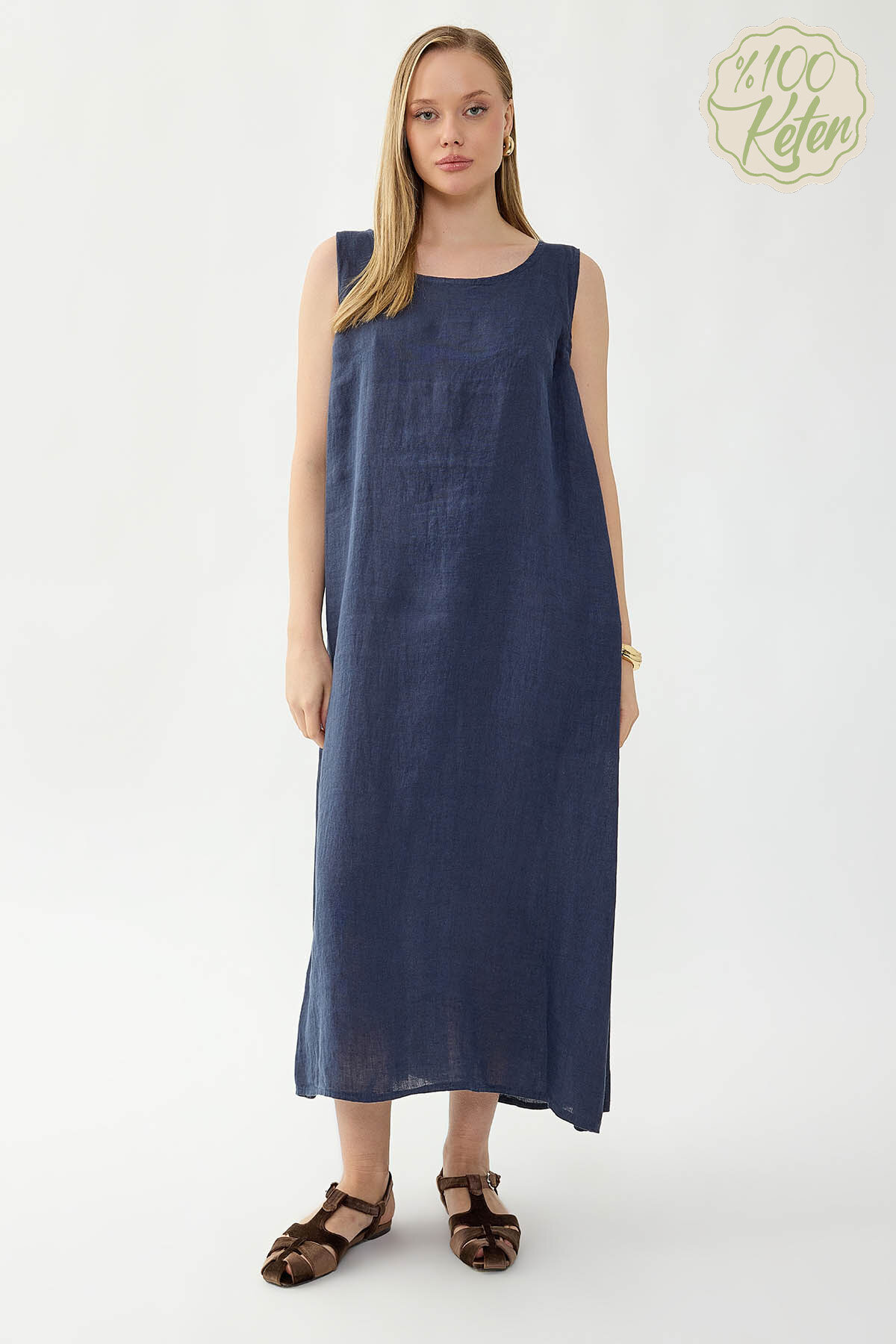 %100 Keten Sıfır Kol Uzun Elbise Lacivert