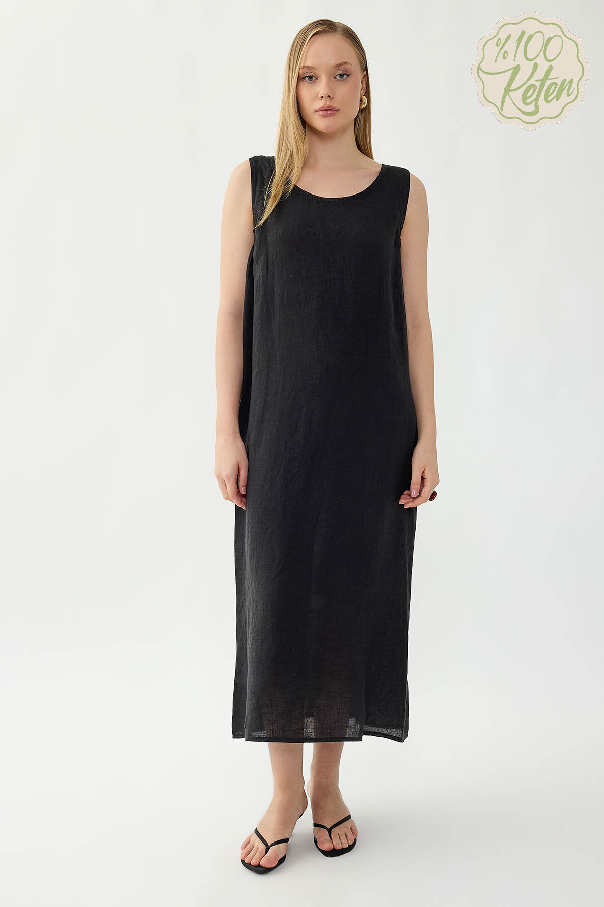 %100 Keten Sıfır Kol Uzun Elbise Siyah