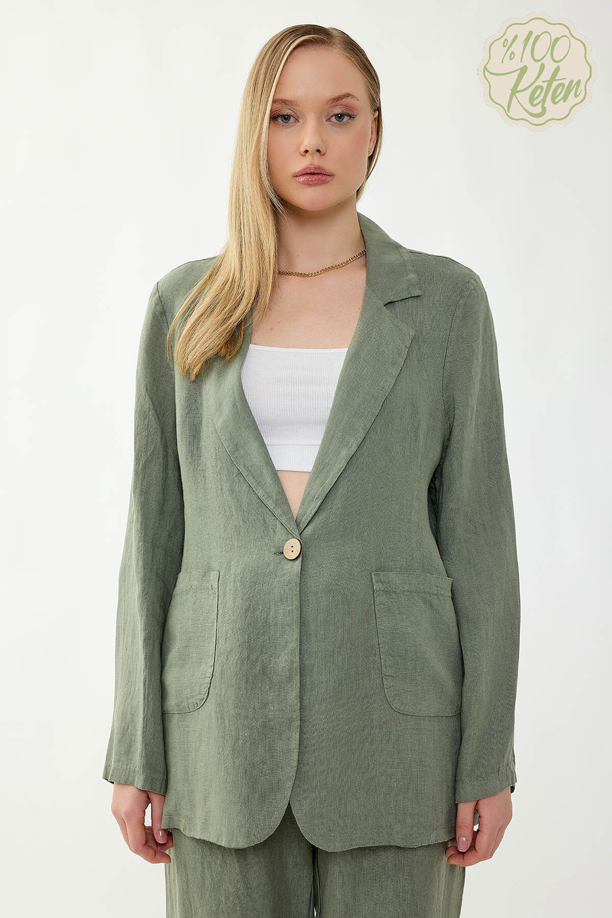 %100 Keten Tek Düğme Cepli Ceket Haki