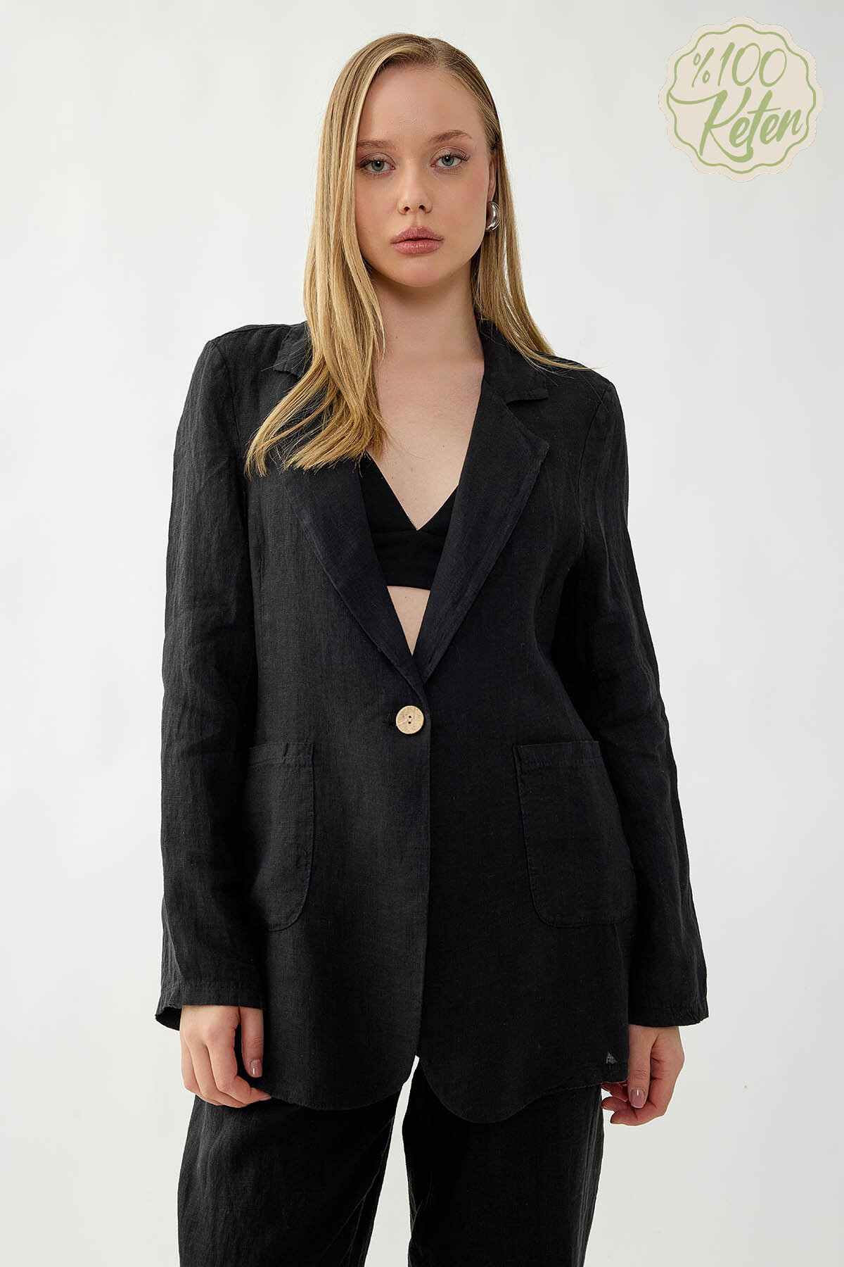 %100 Keten Tek Düğme Cepli Ceket Siyah