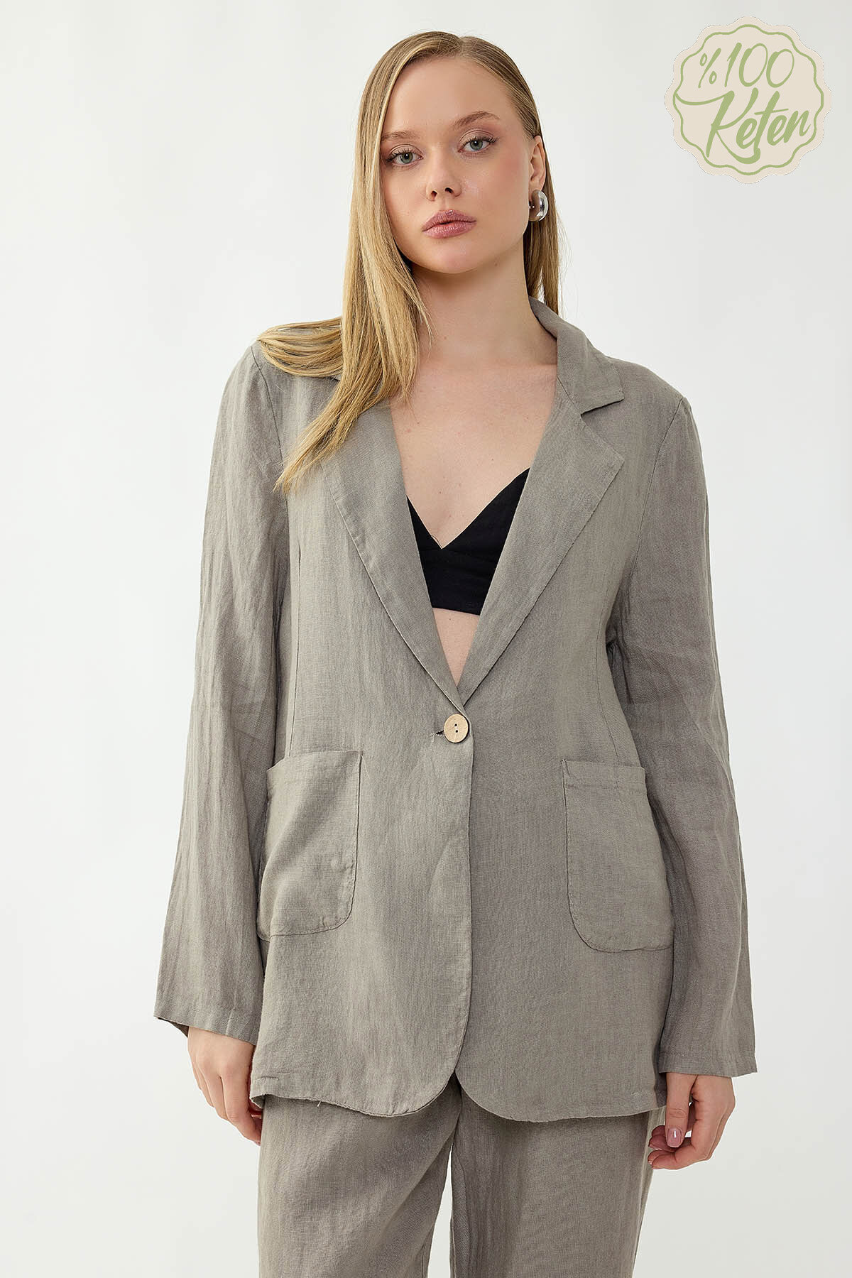 %100 Keten Tek Düğme Cepli Ceket Vizon