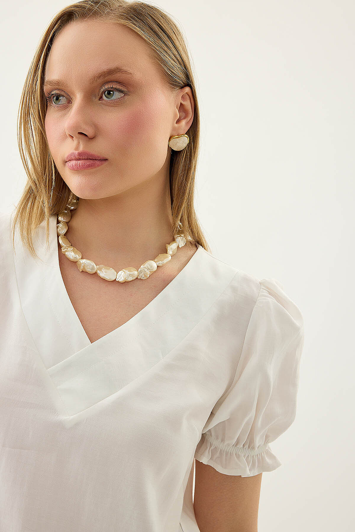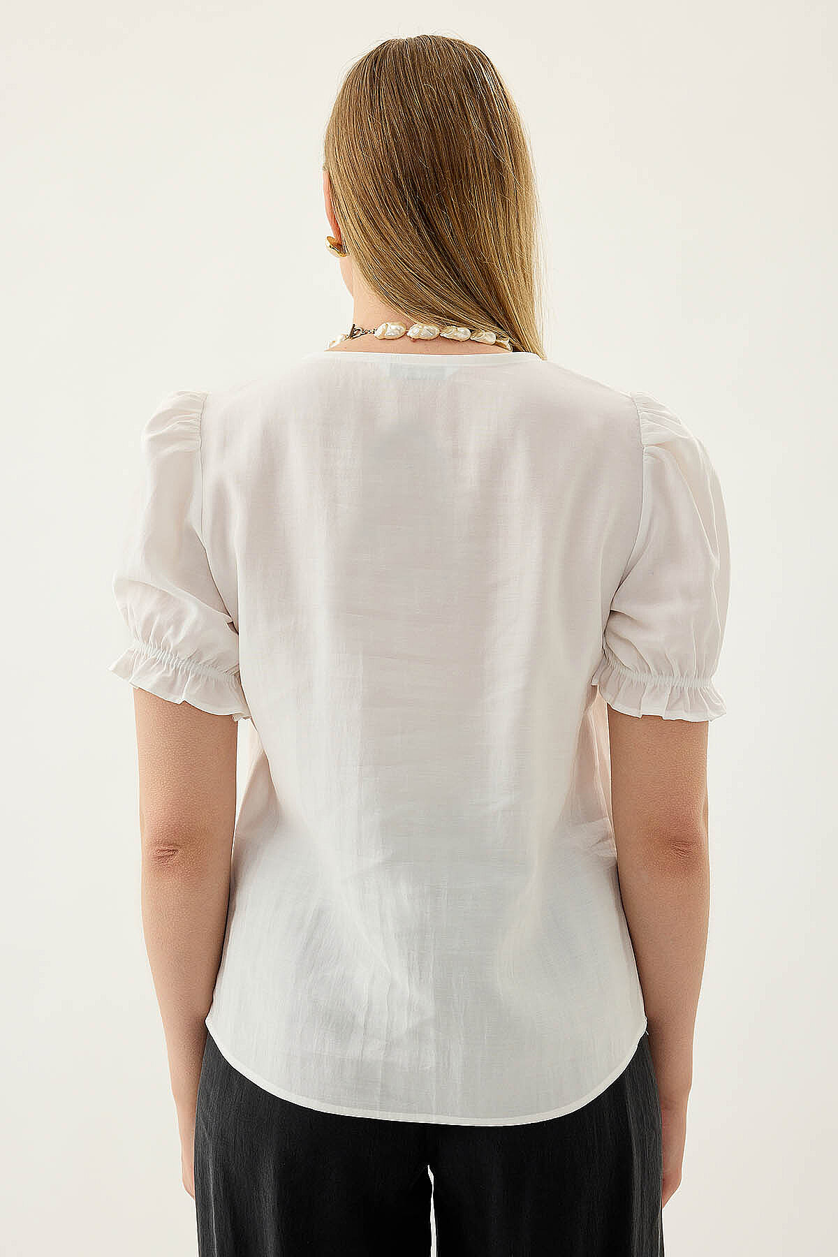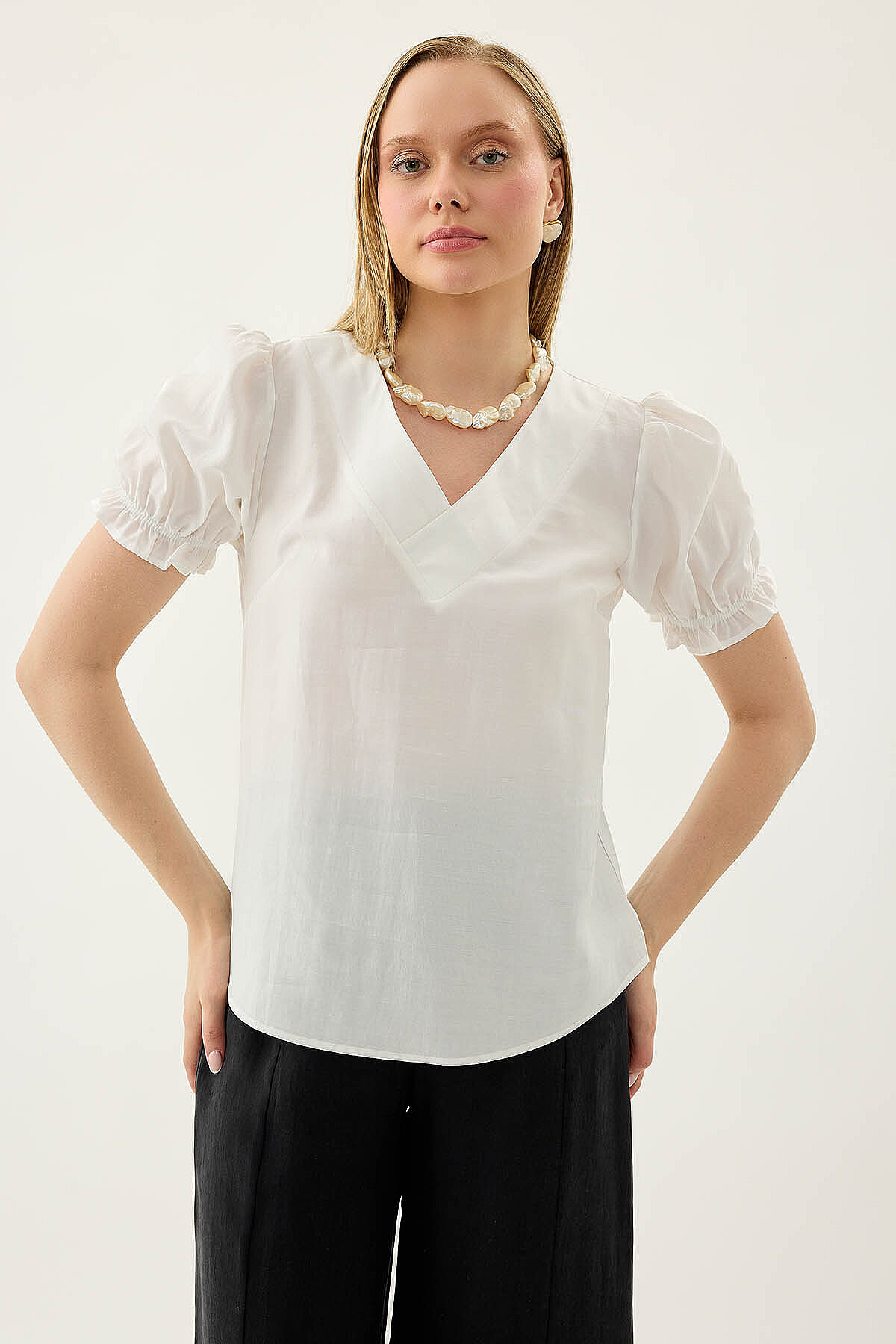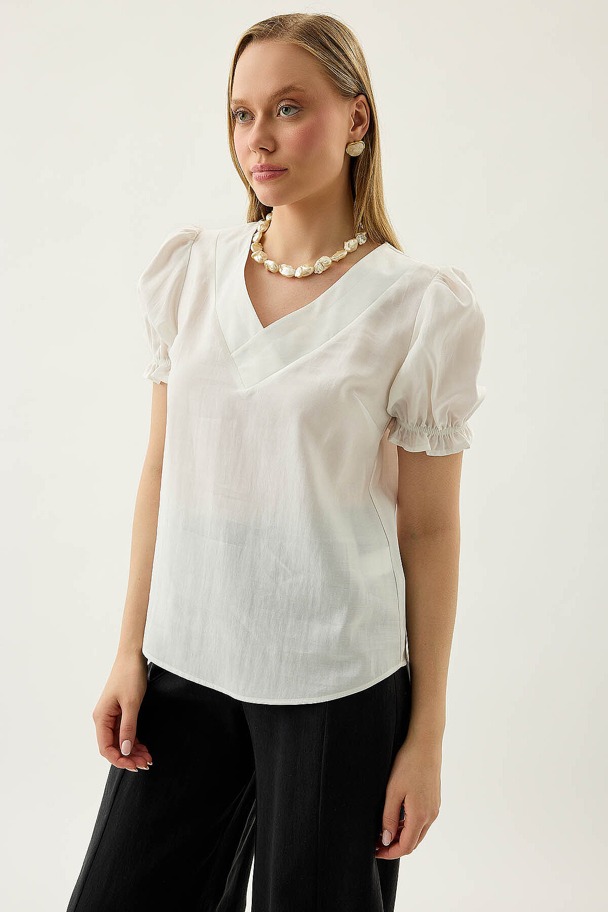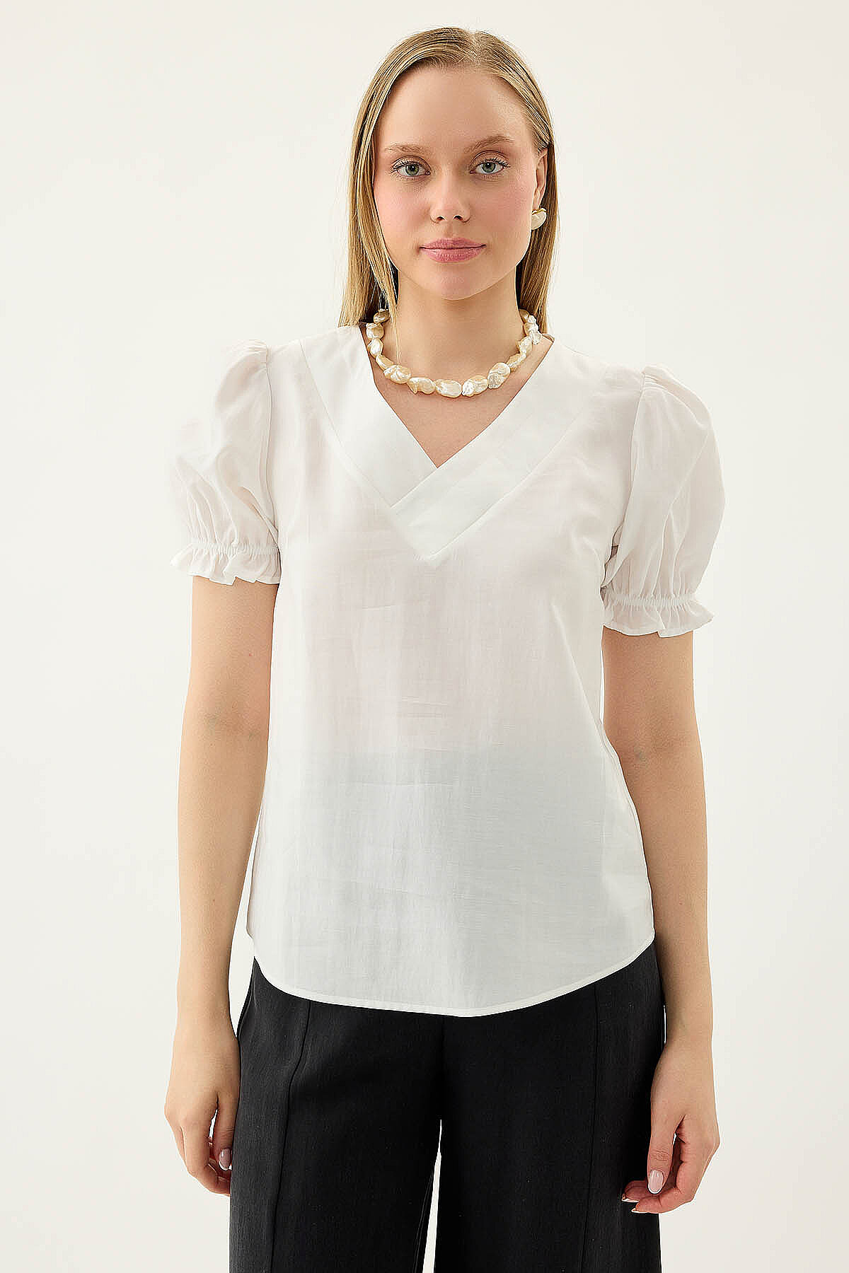 V Yaka Balon Kol Bluz Beyaz