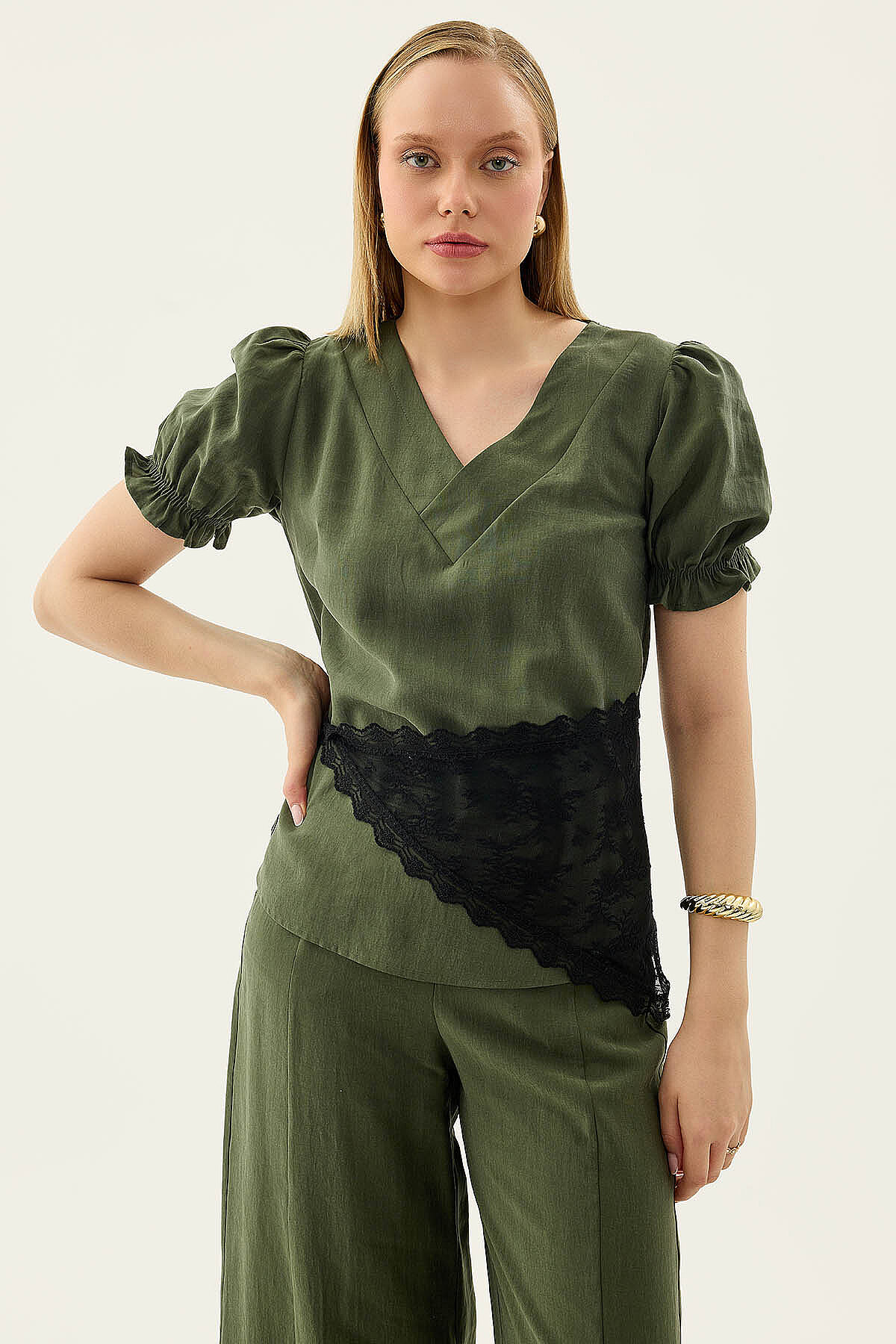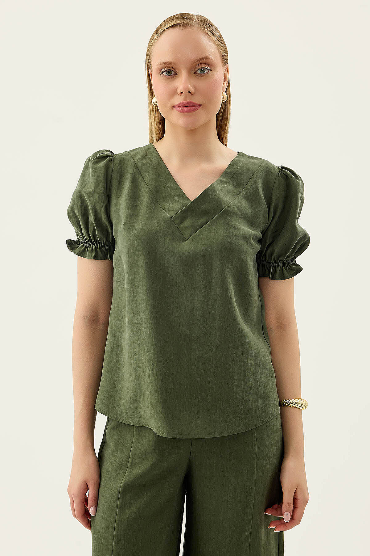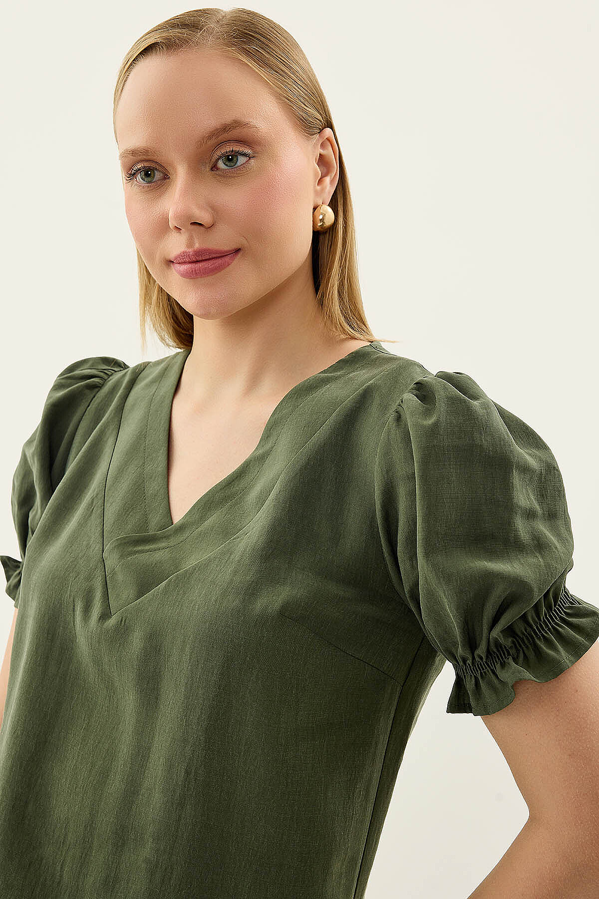 V Yaka Balon Kol Bluz Haki