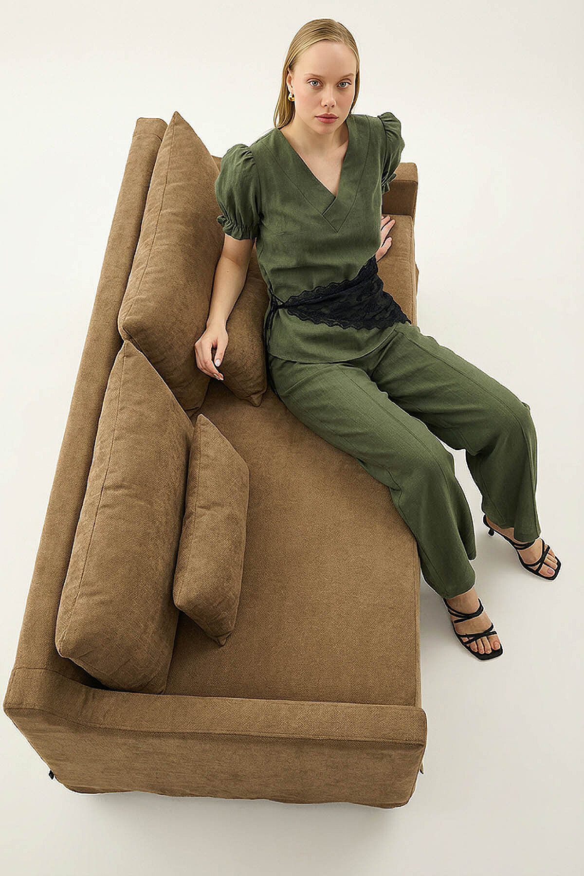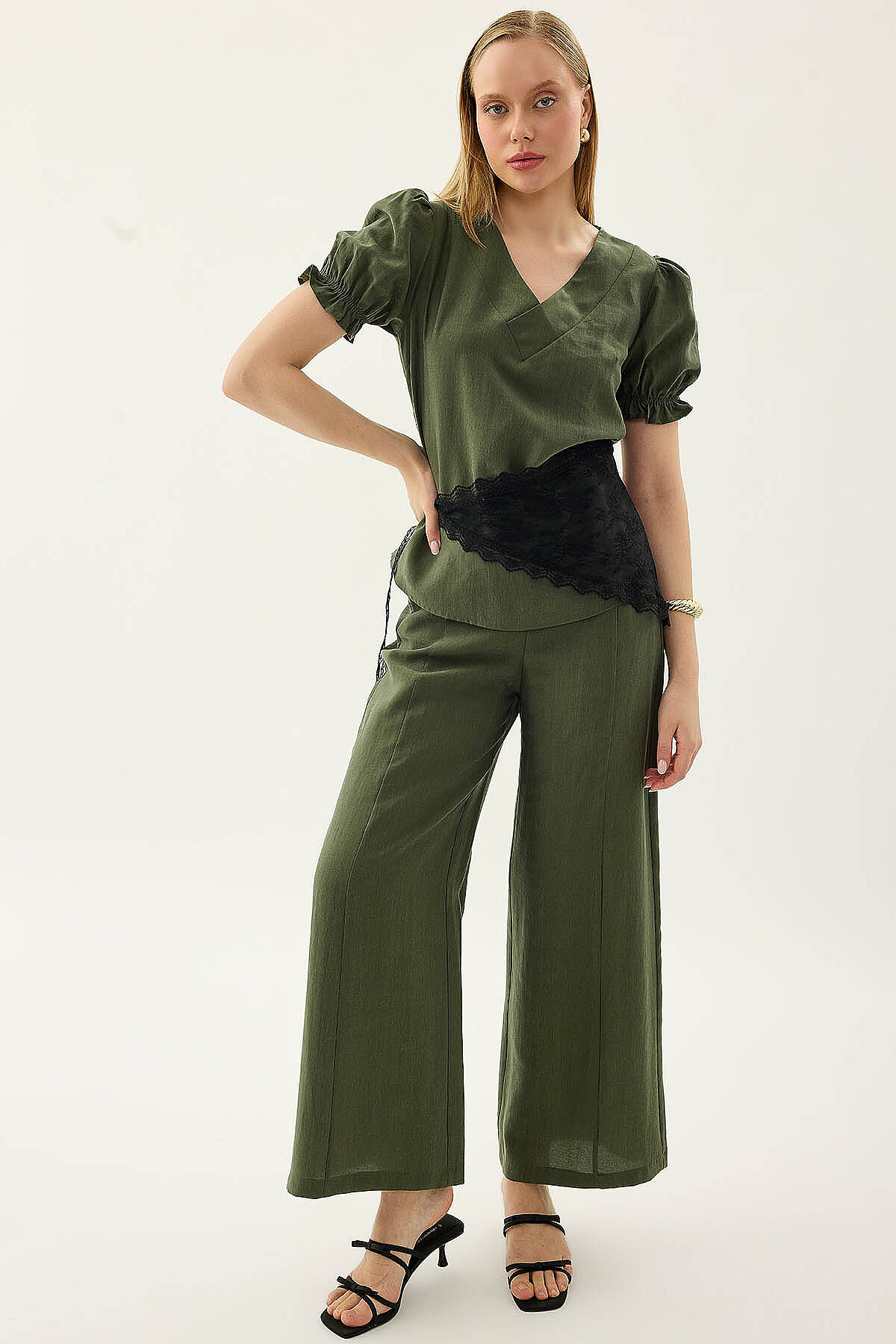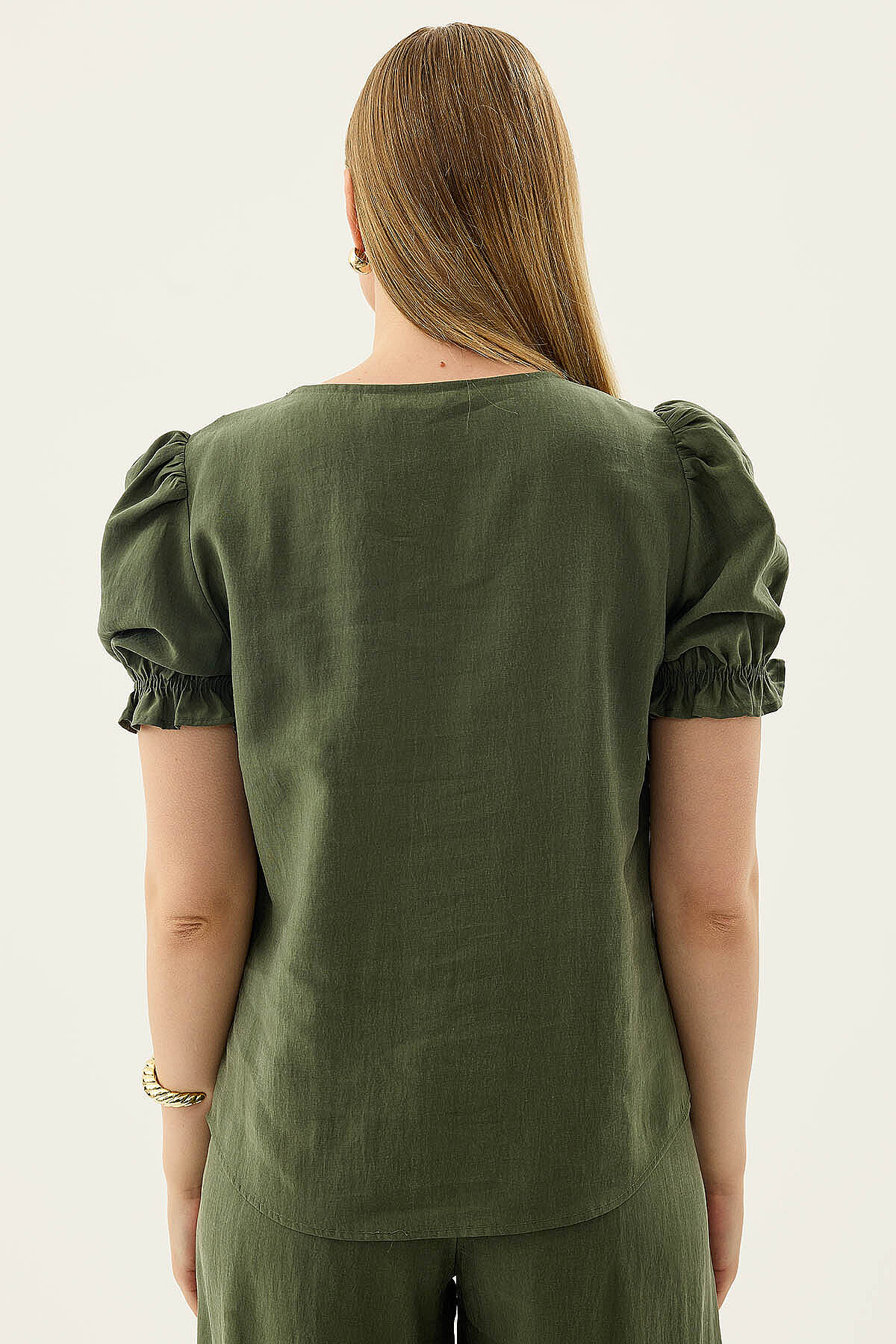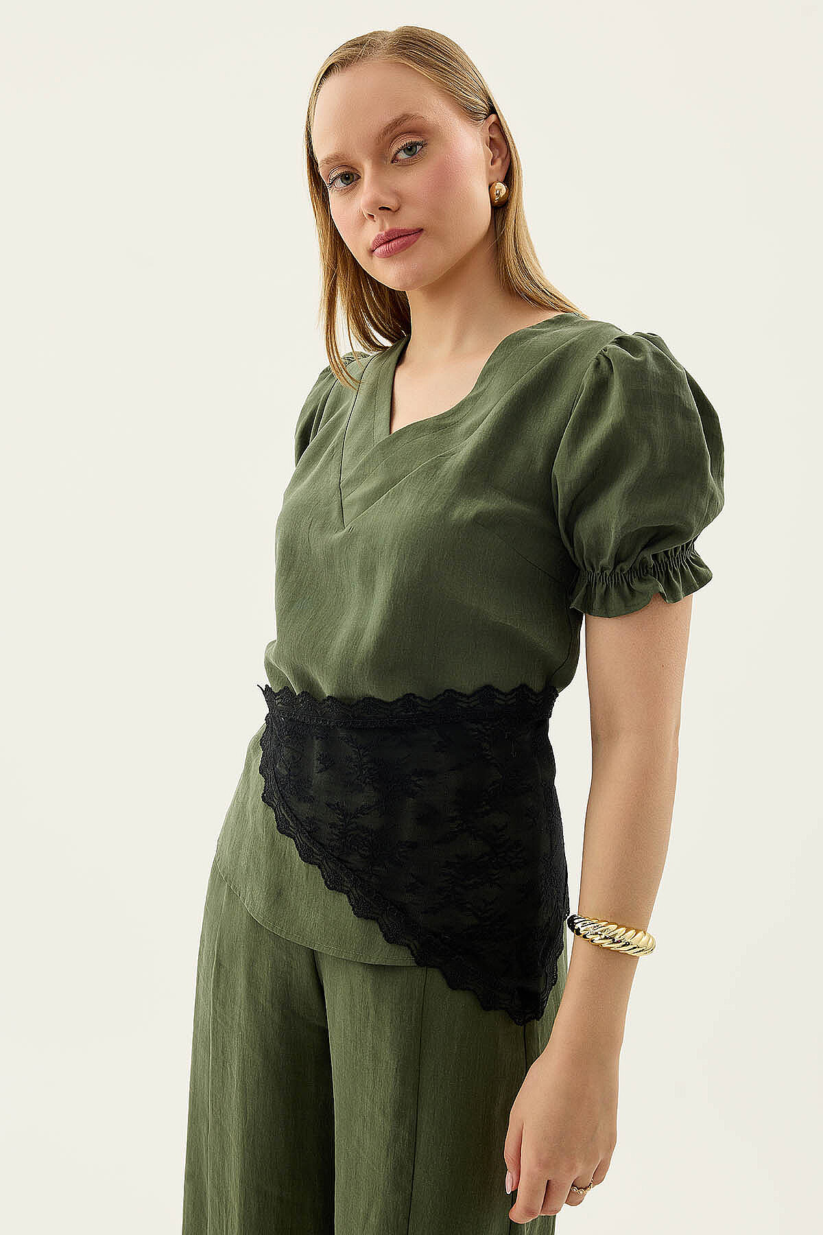 V Yaka Balon Kol Bluz Haki