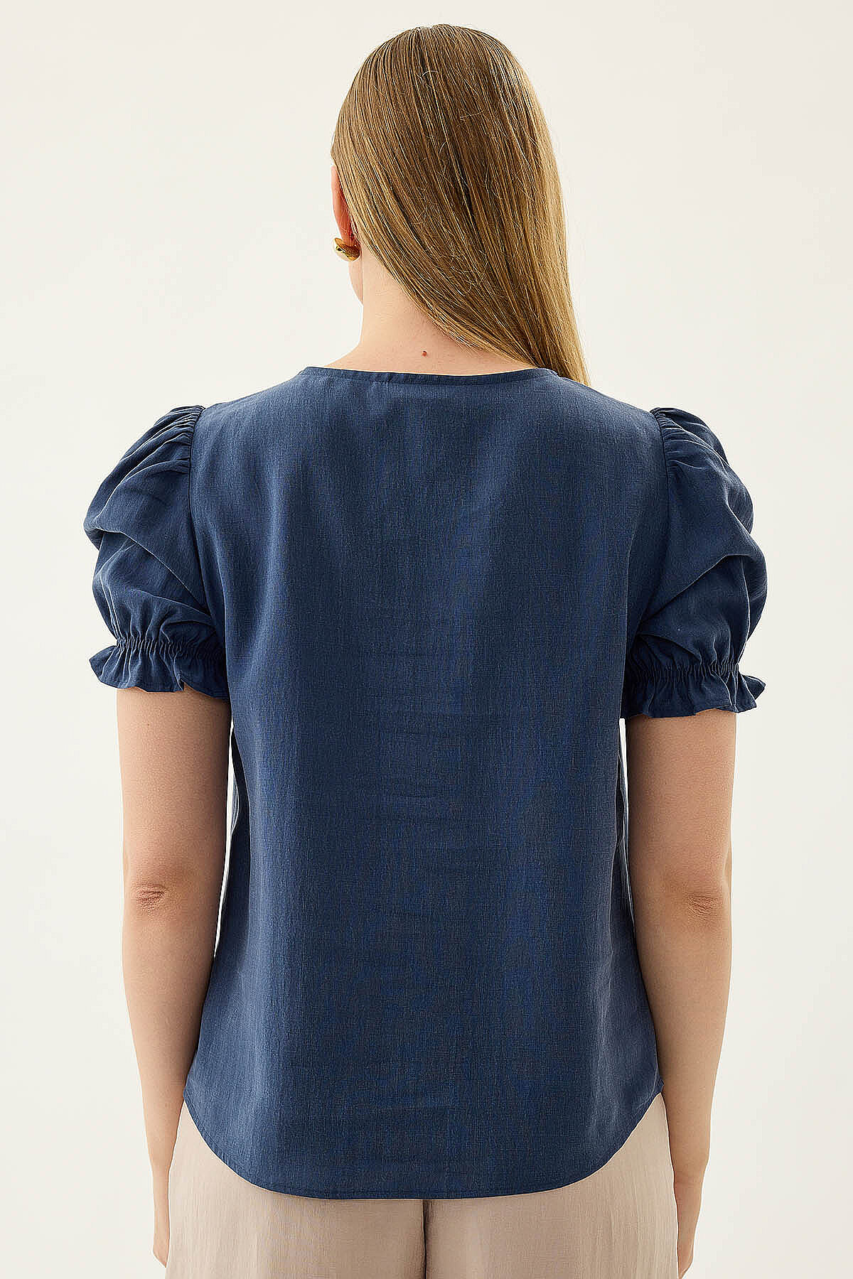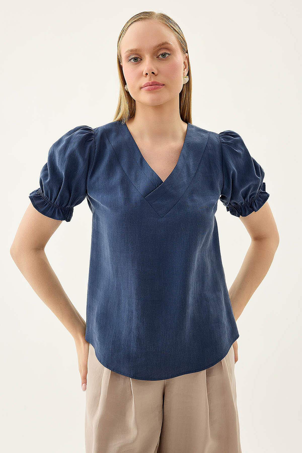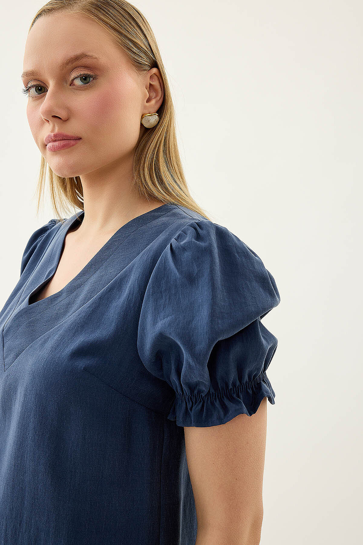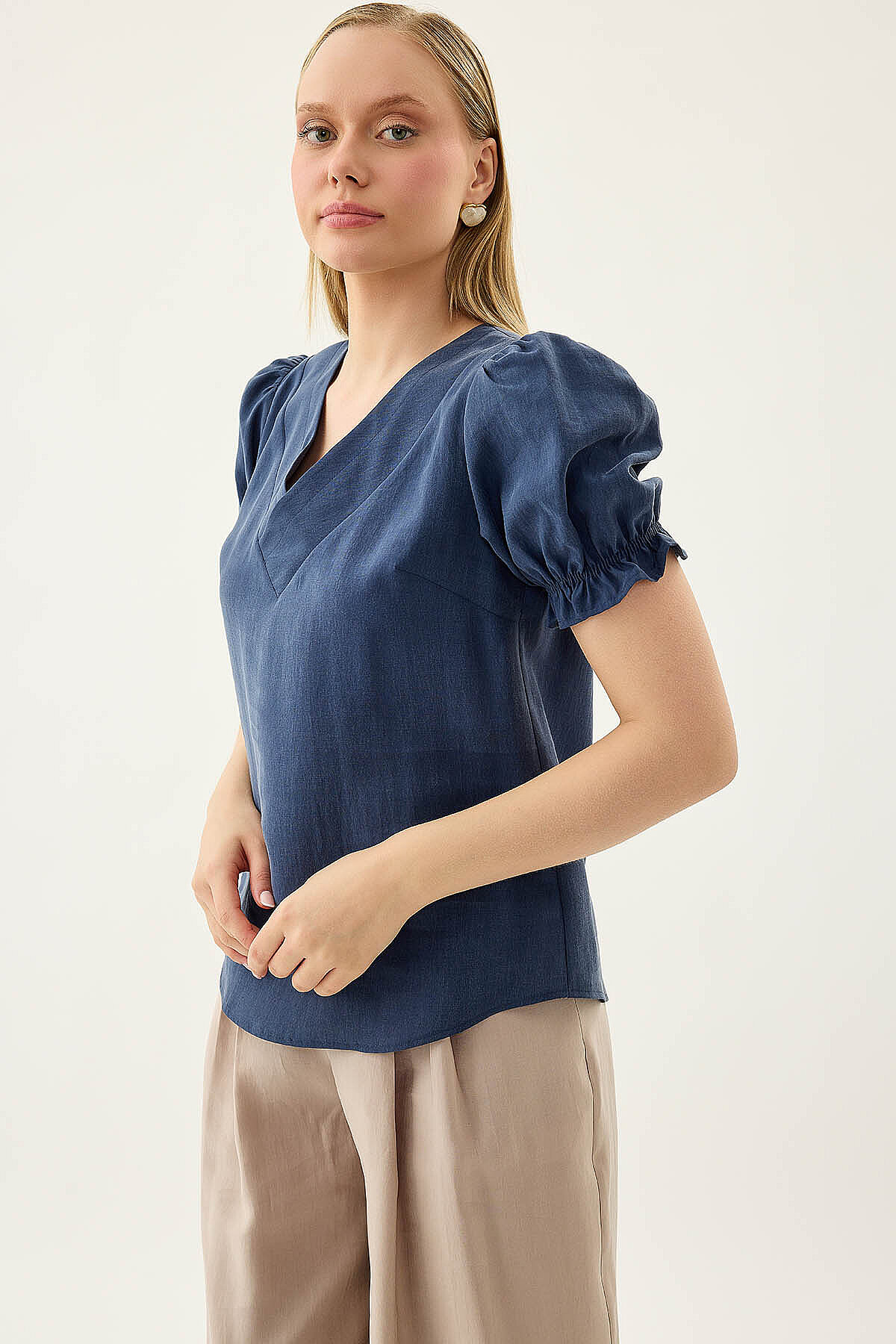 V Yaka Balon Kol Bluz Lacivert