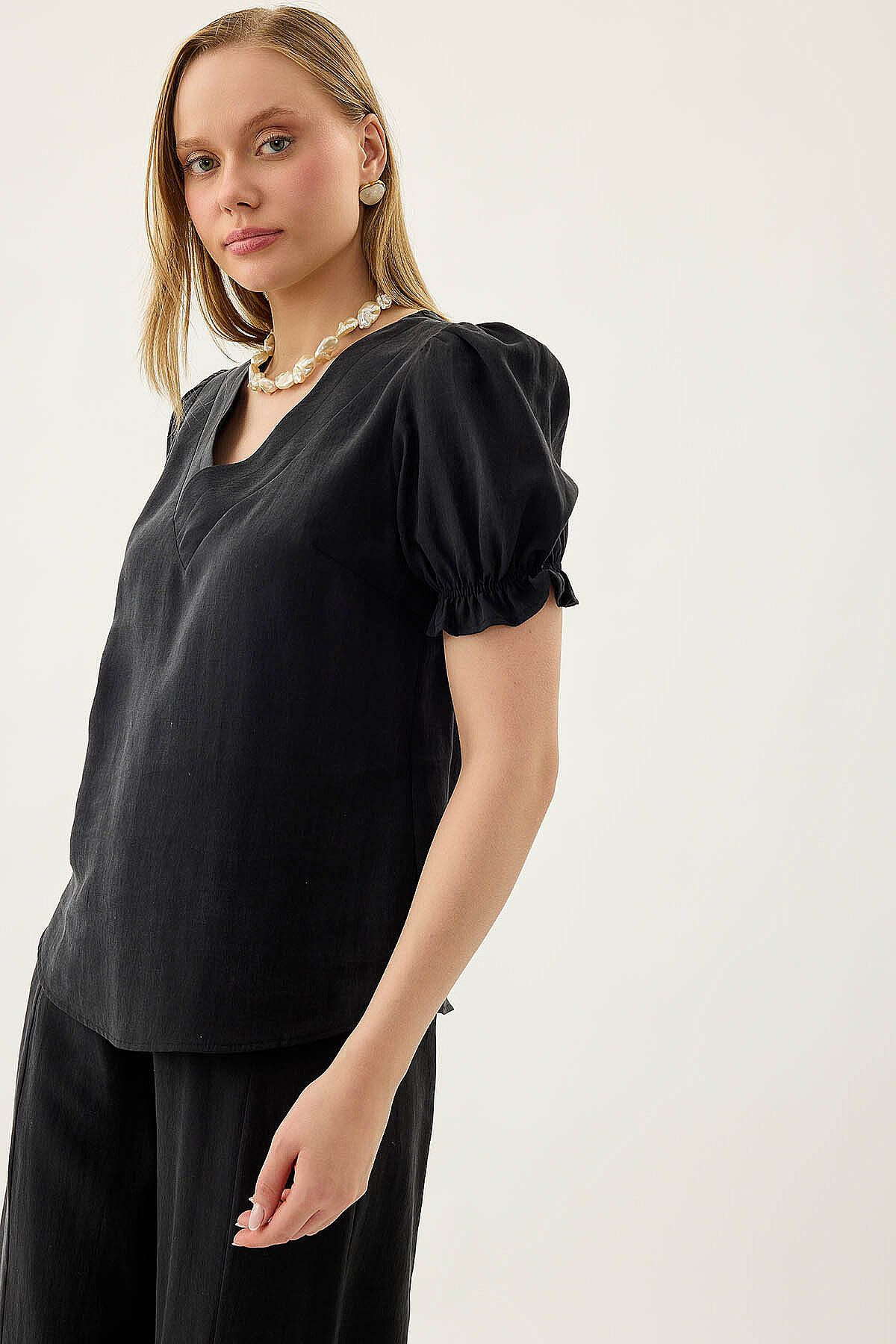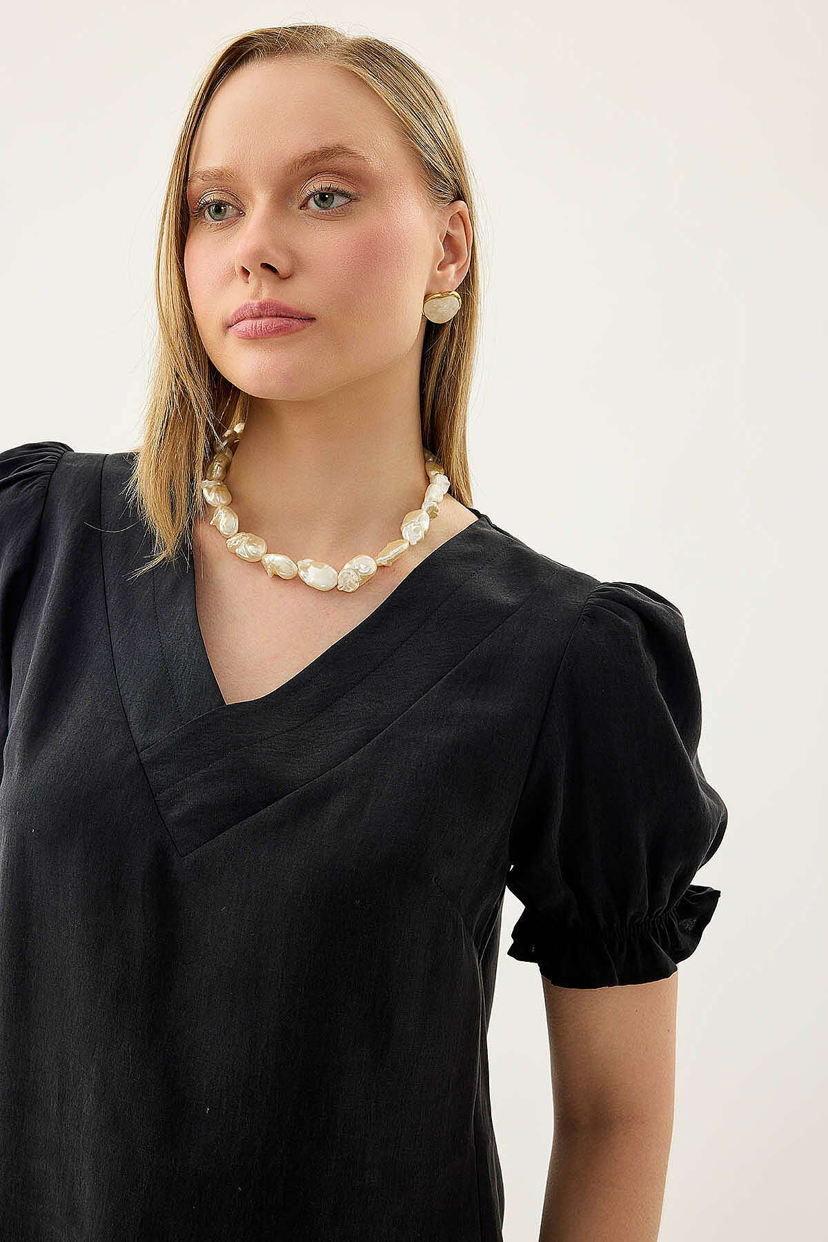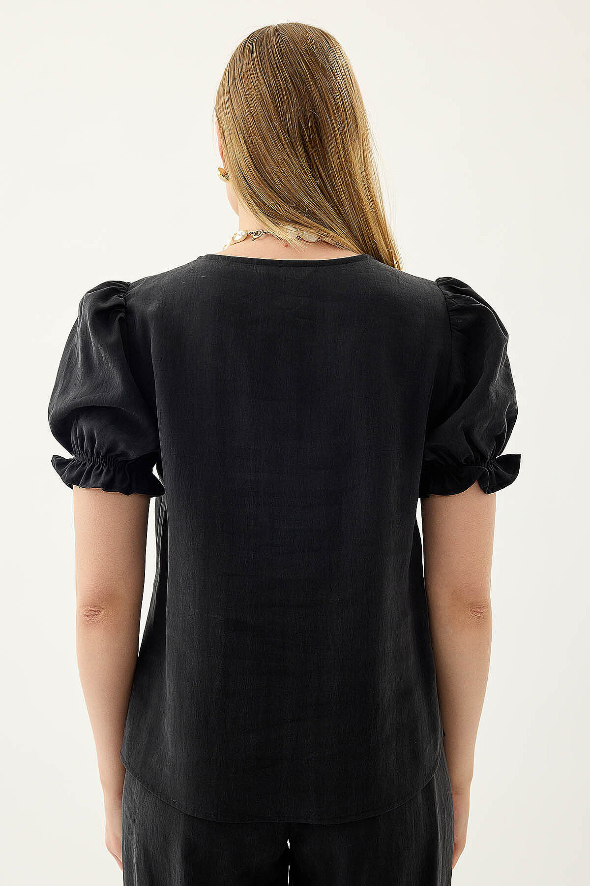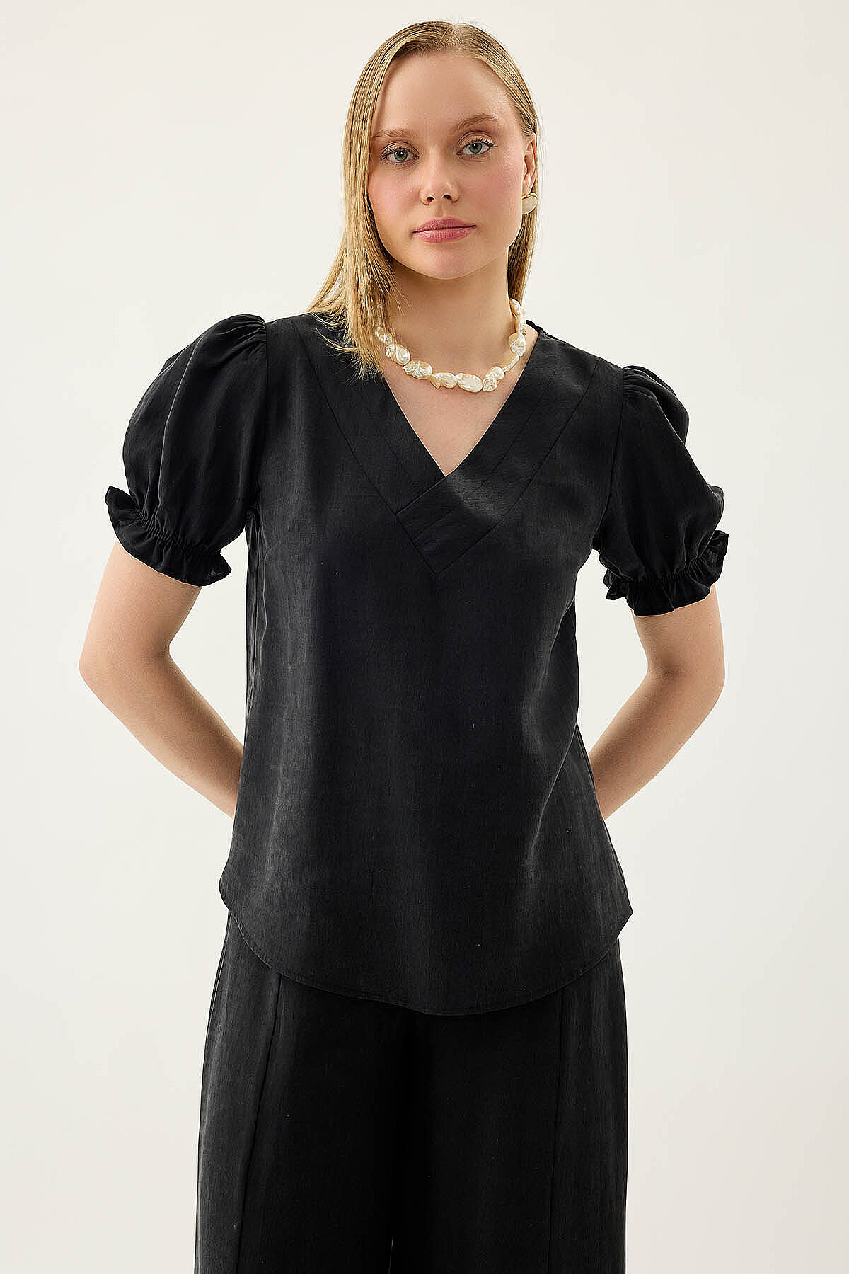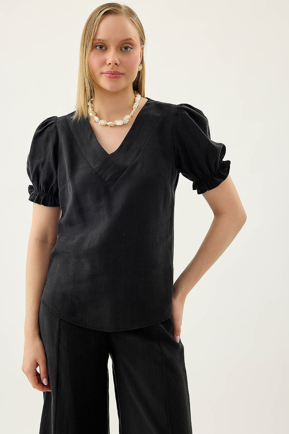 V Yaka Balon Kol Bluz Siyah