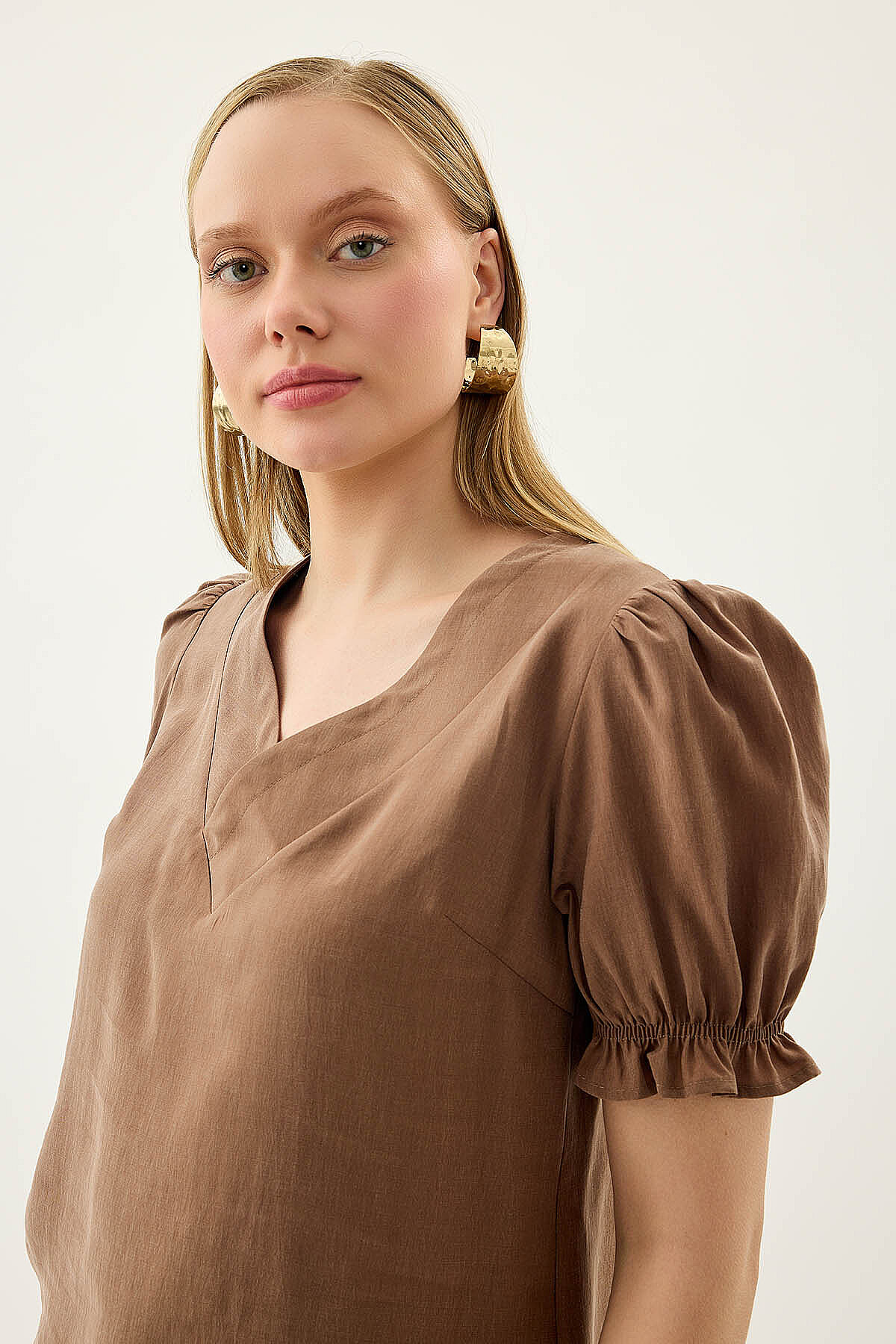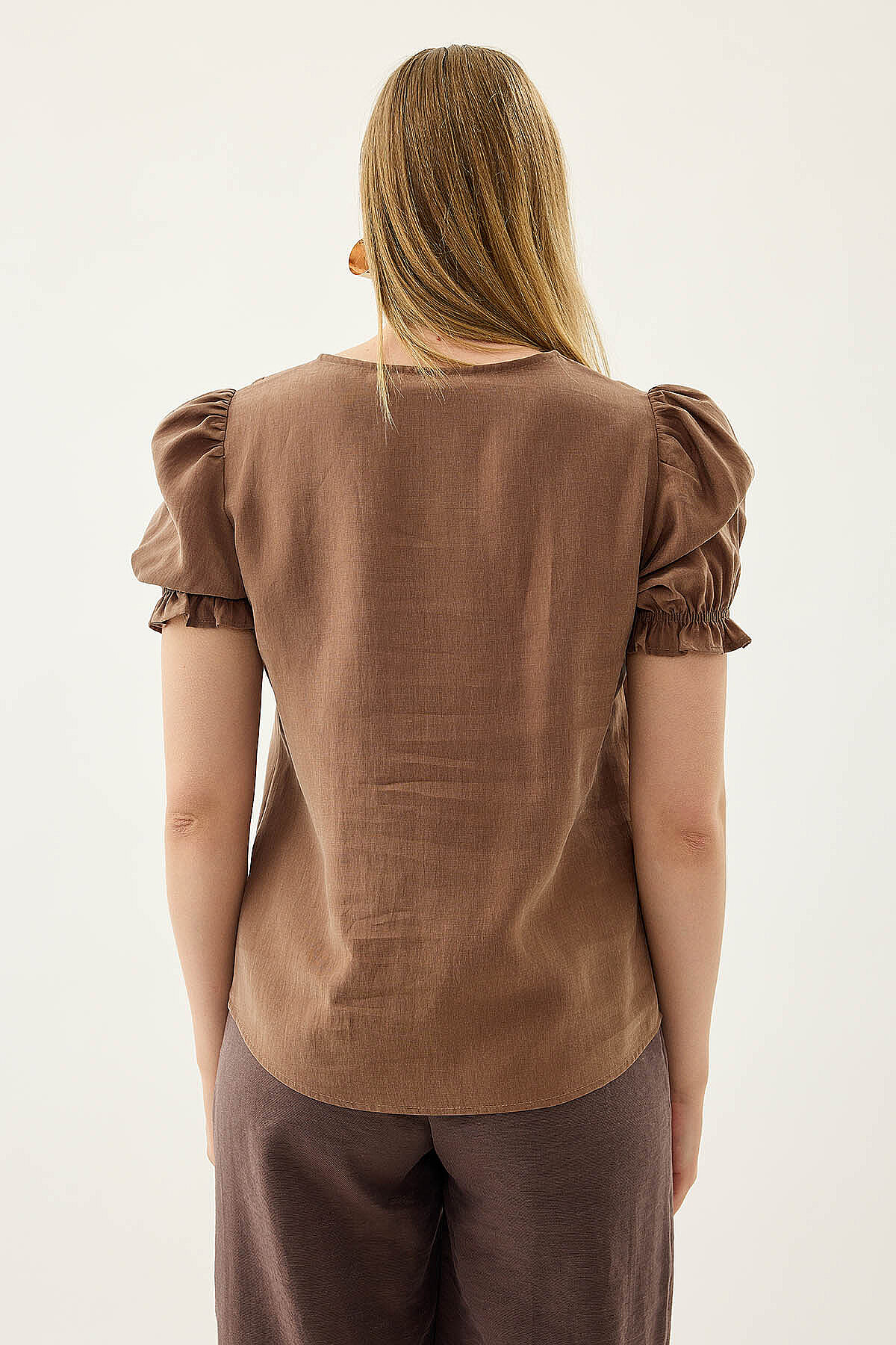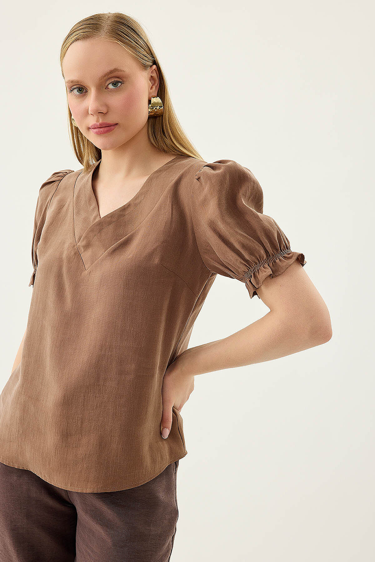 V Yaka Balon Kol Bluz Kahve