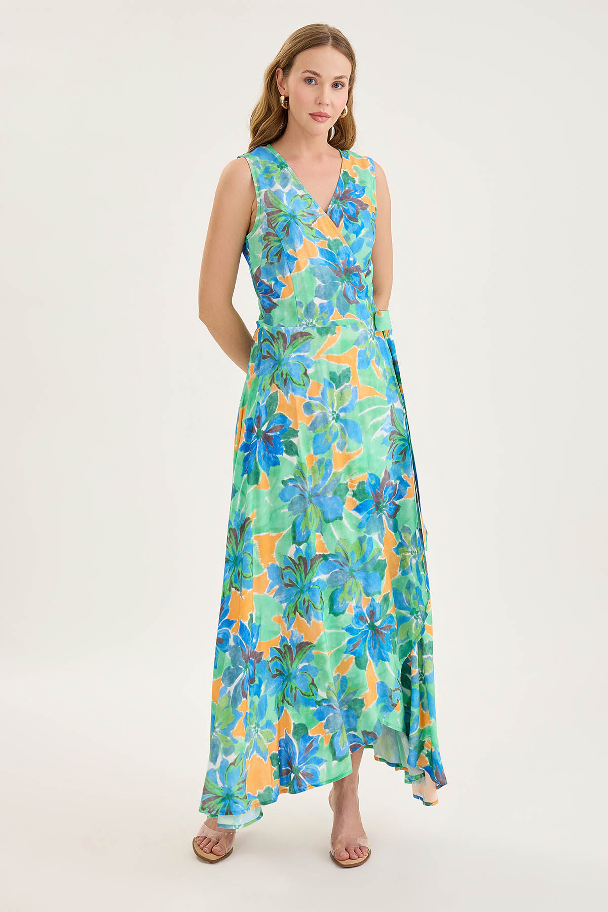 V Yaka Beli Bağlamalı Çiçek Desen Elbise