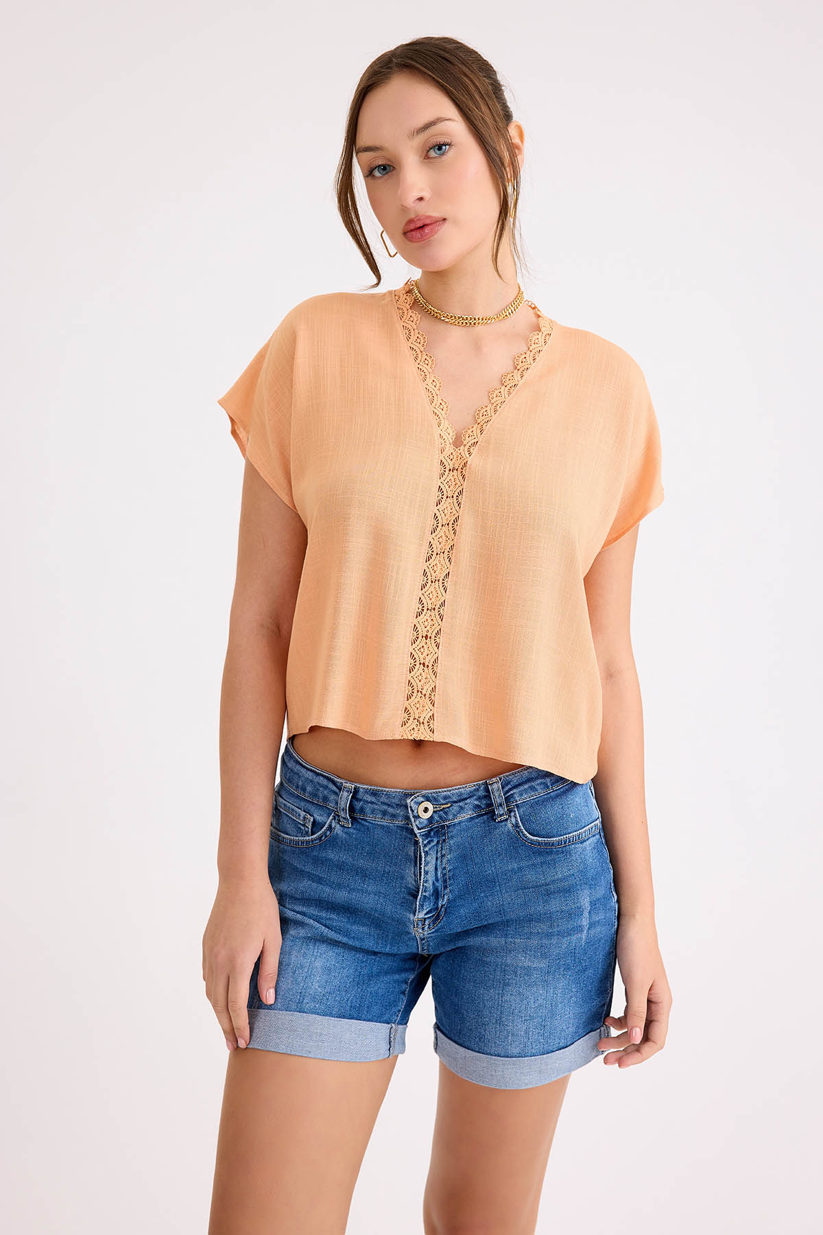 V Yaka Güpürlü Kısa Kol Keten Bluz