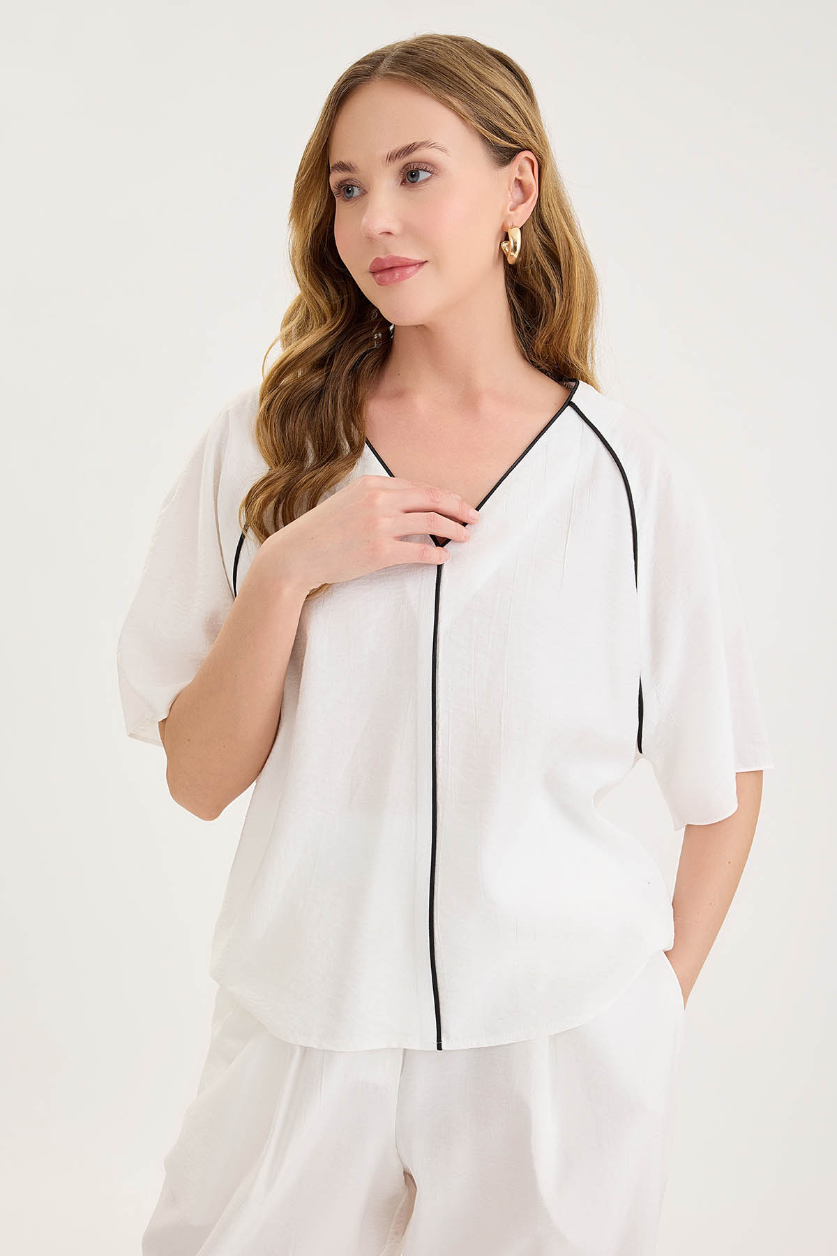 V Yaka Önü Şeritli Kısa Kol Bluz