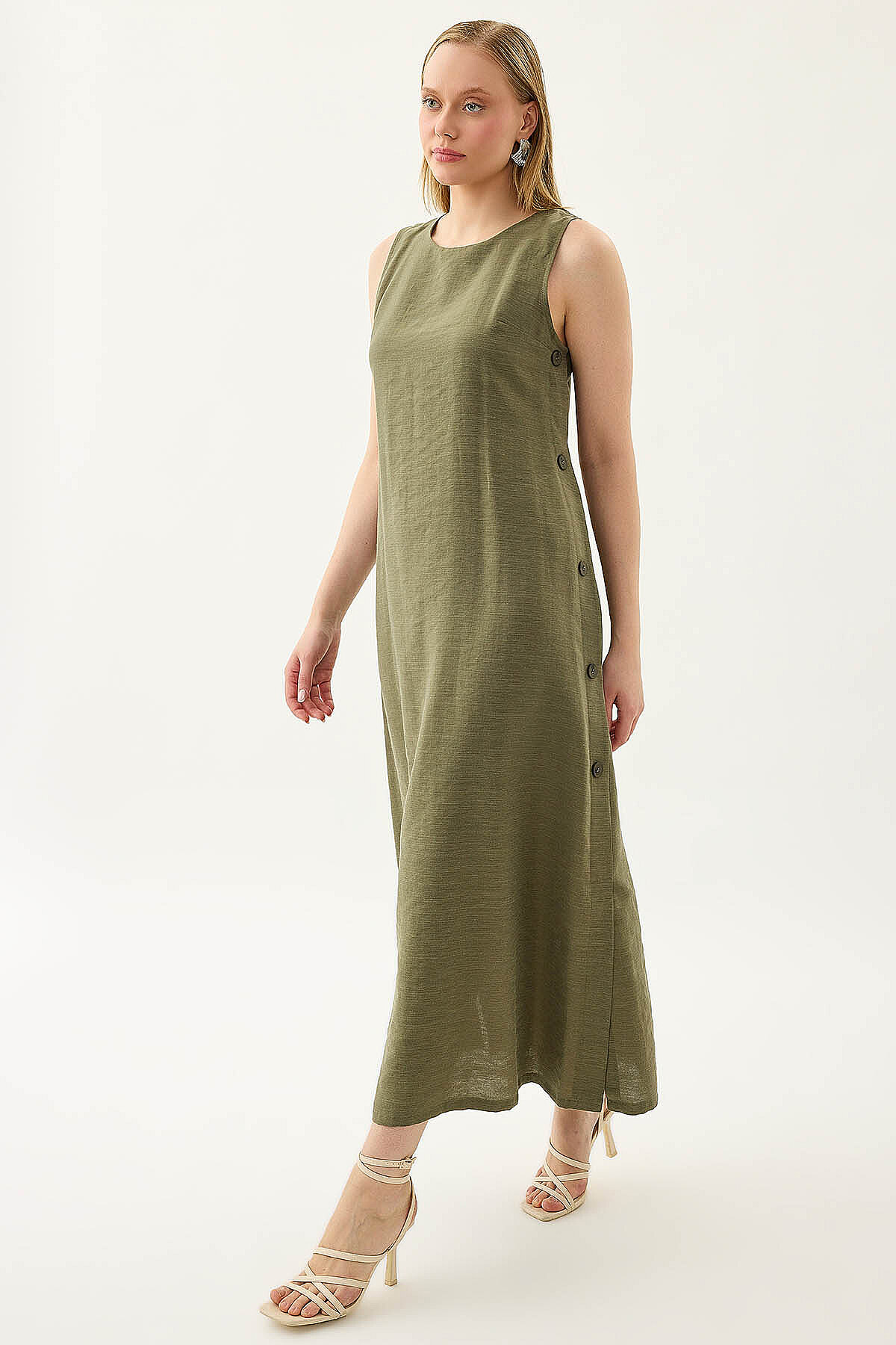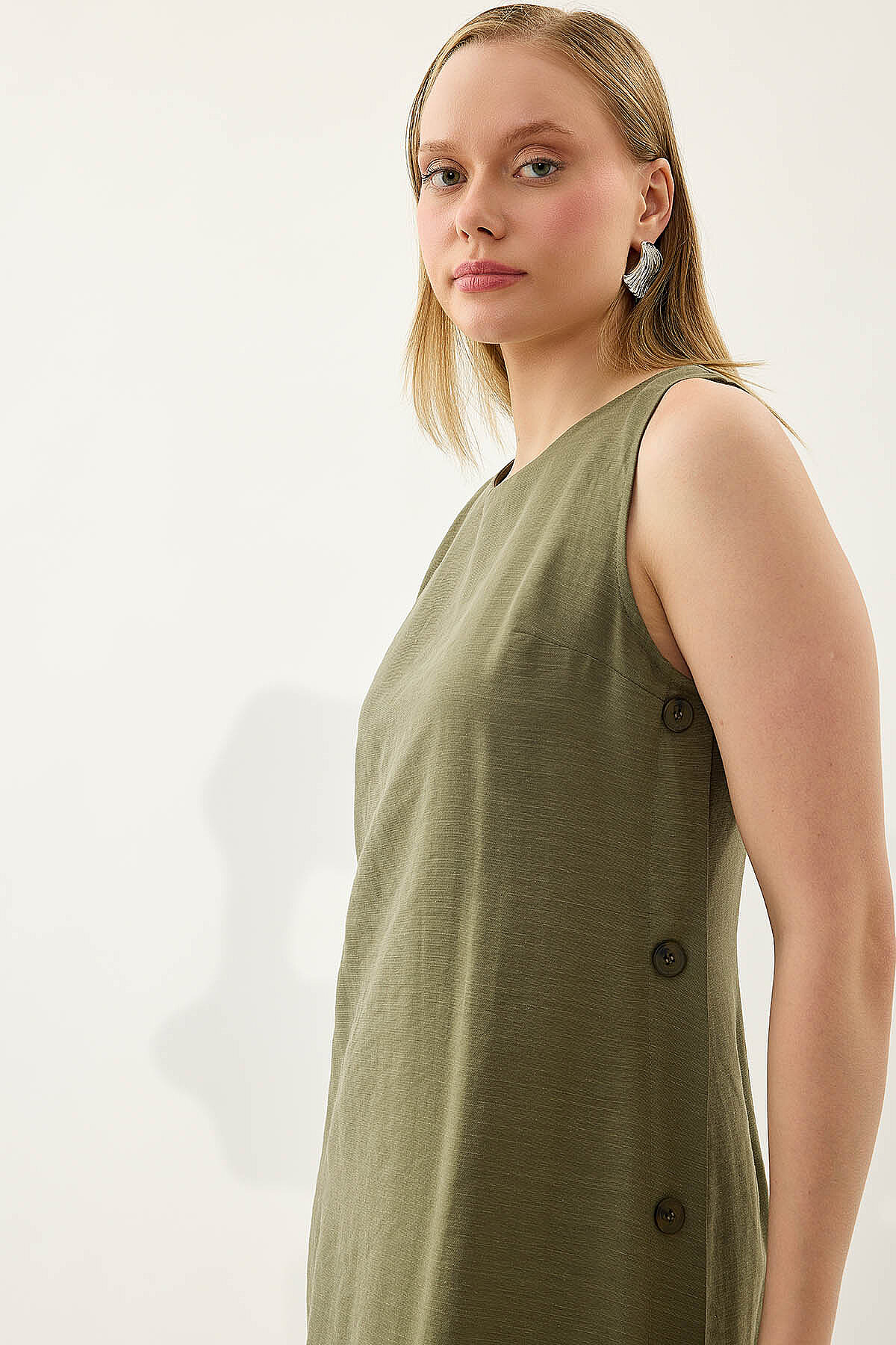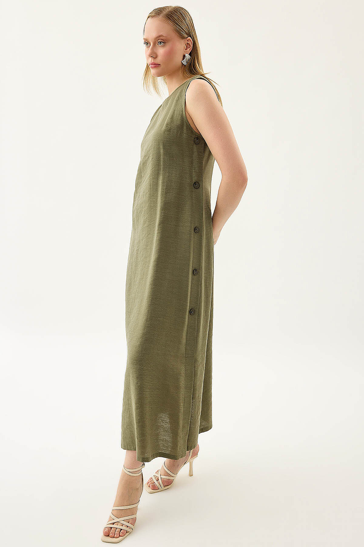 Yanları Düğmeli Sıfır Kol Elbise Haki