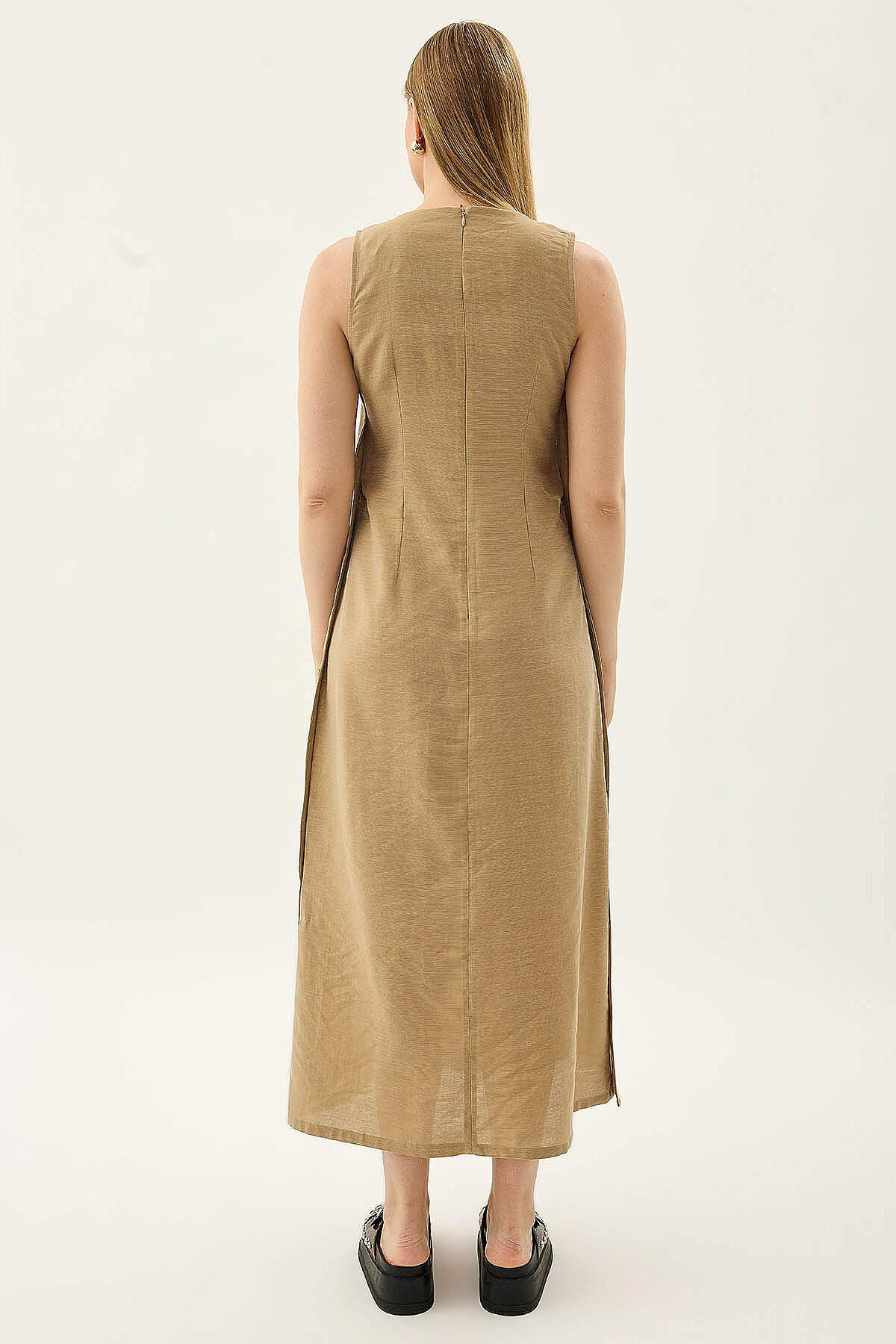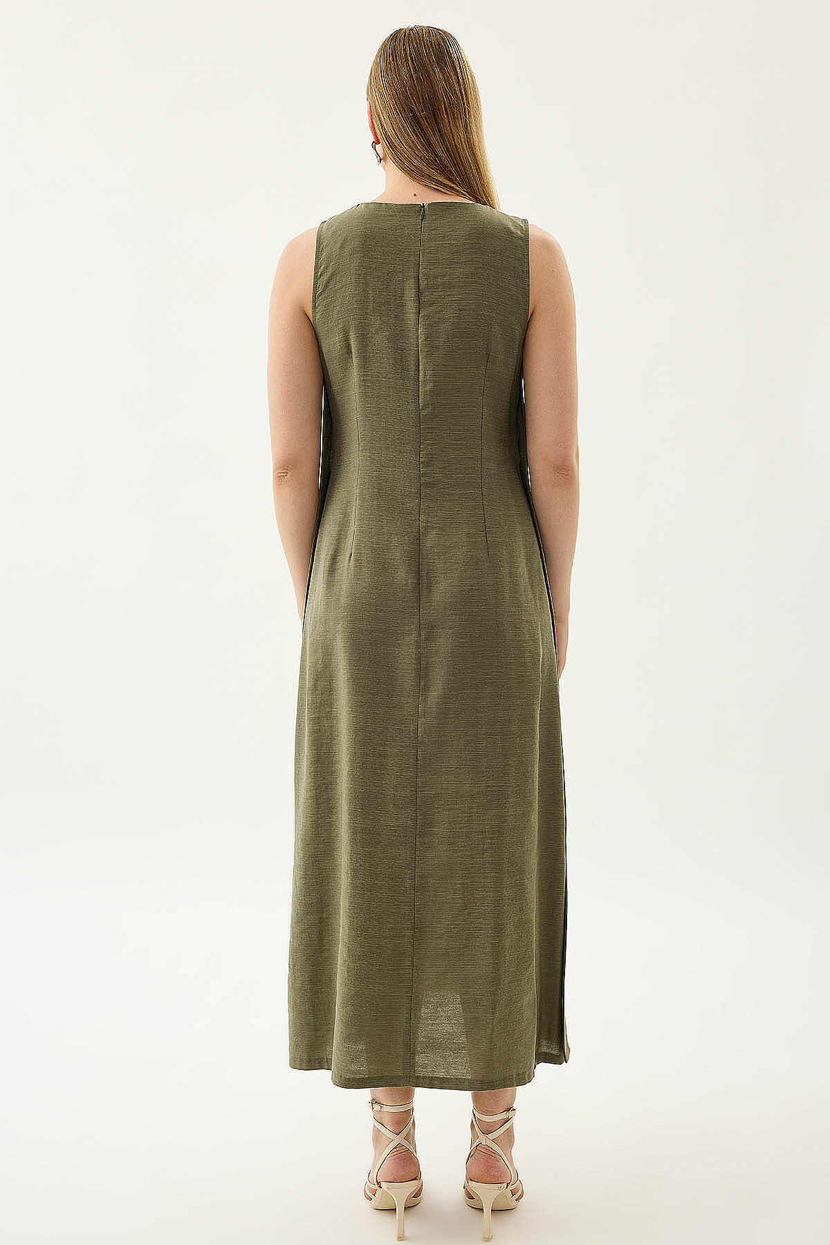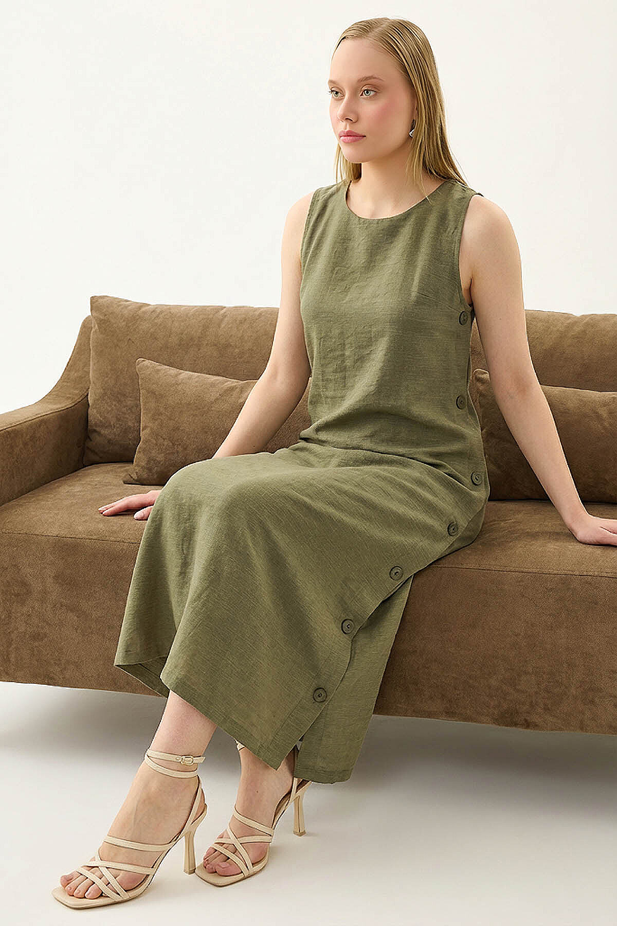 Yanları Düğmeli Sıfır Kol Elbise Haki