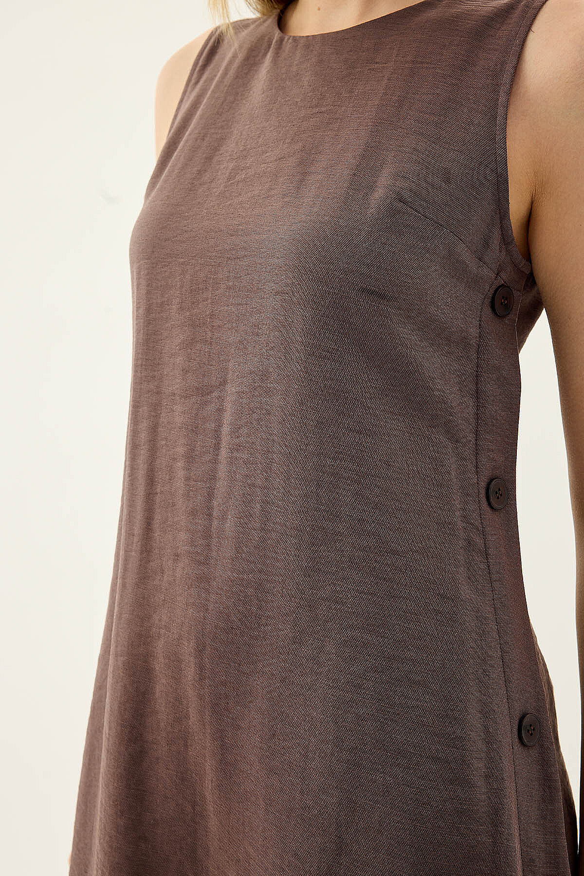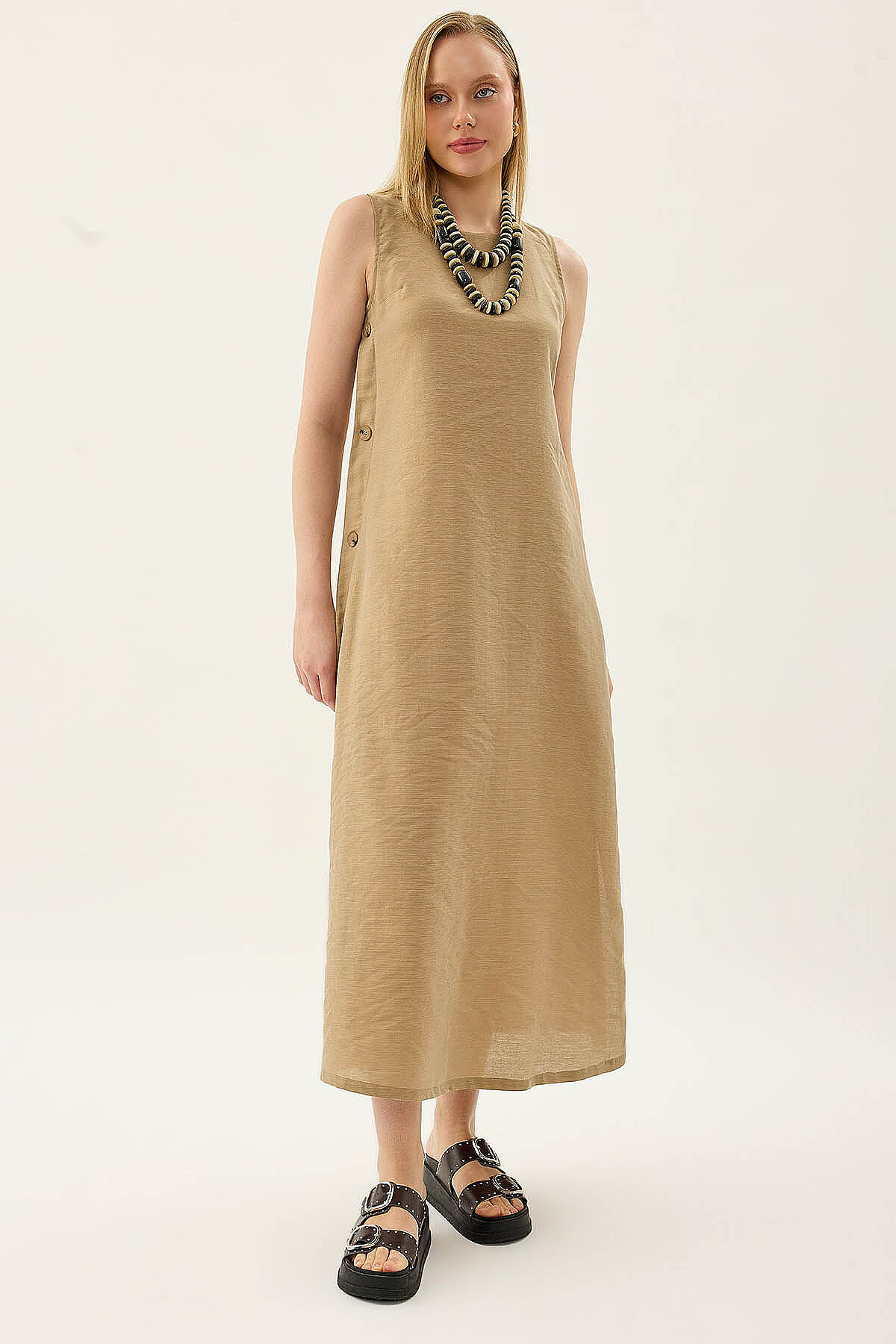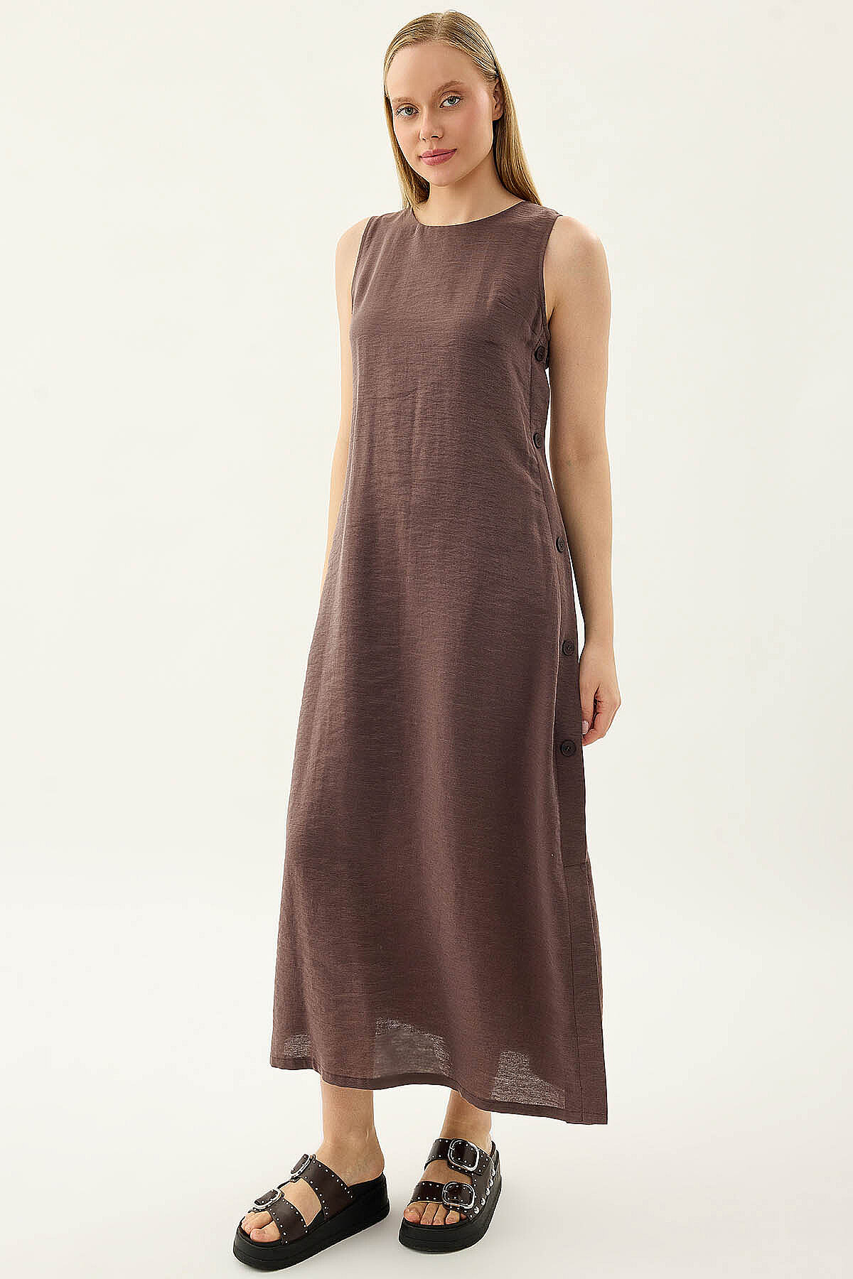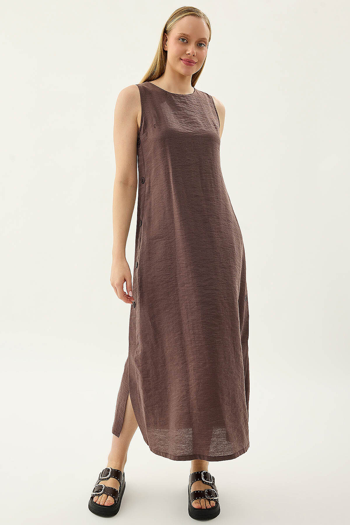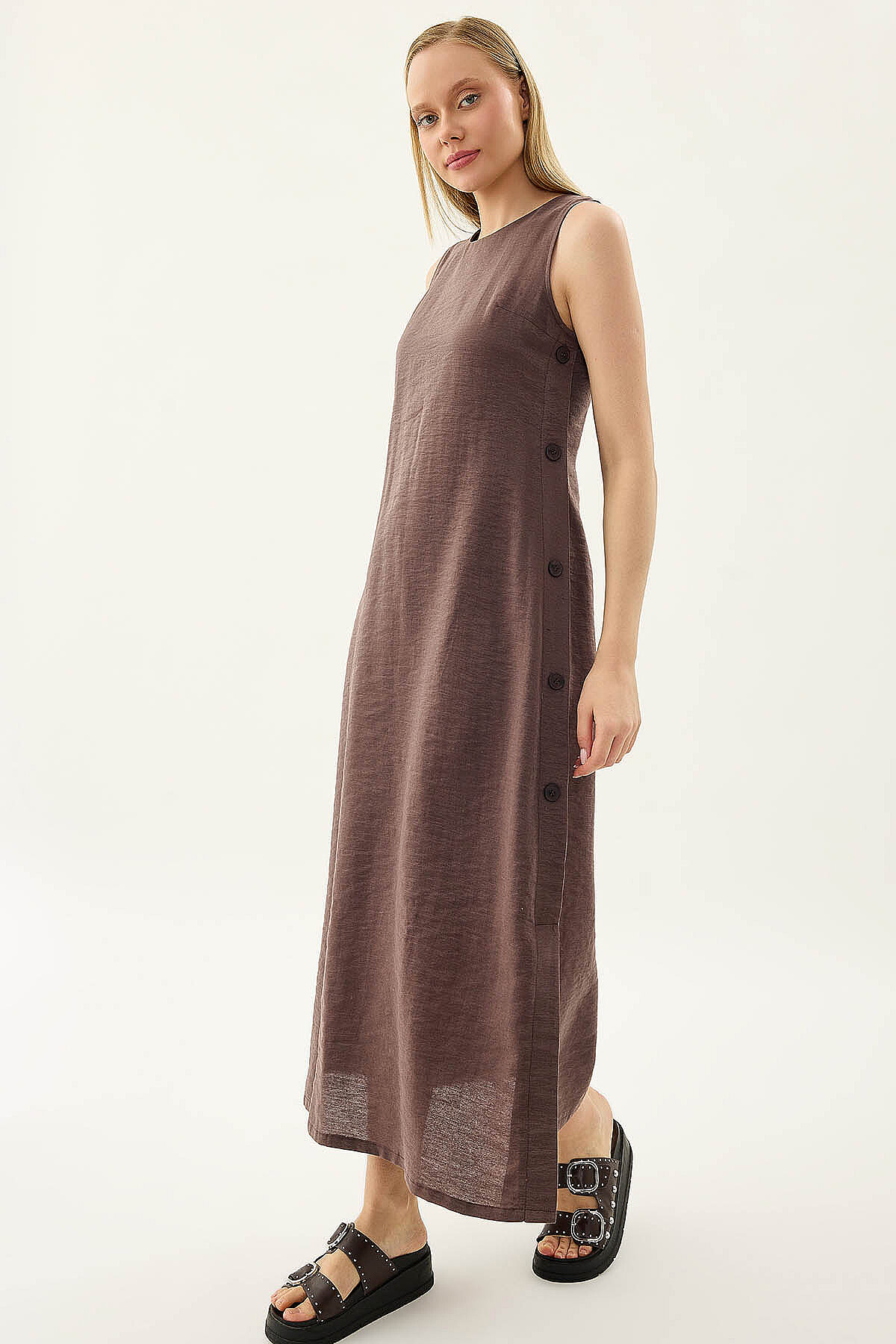 Yanları Düğmeli Sıfır Kol Elbise Kahve