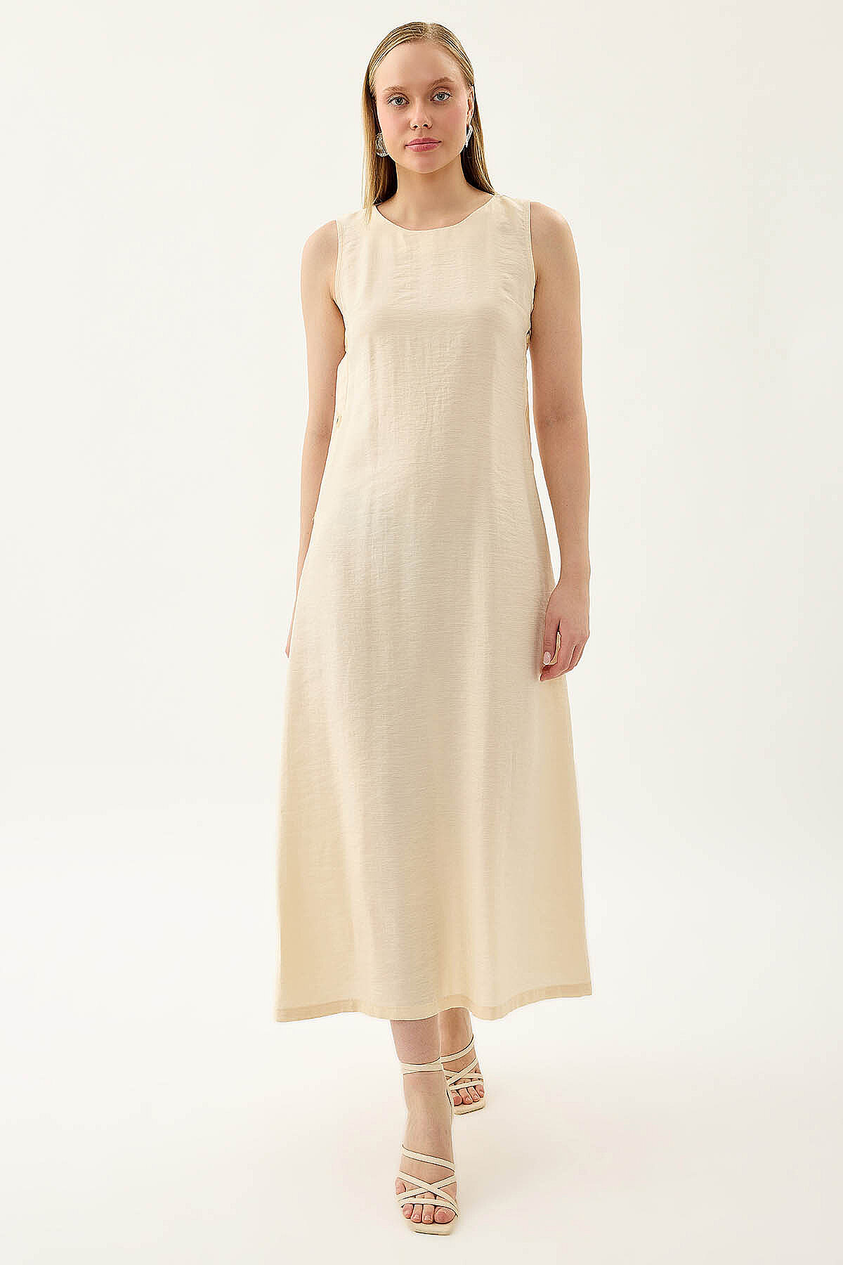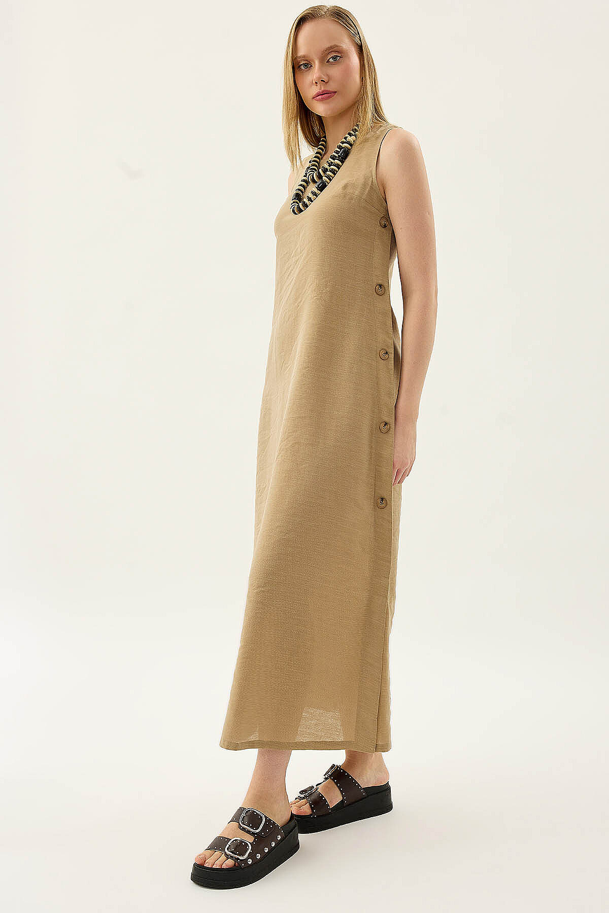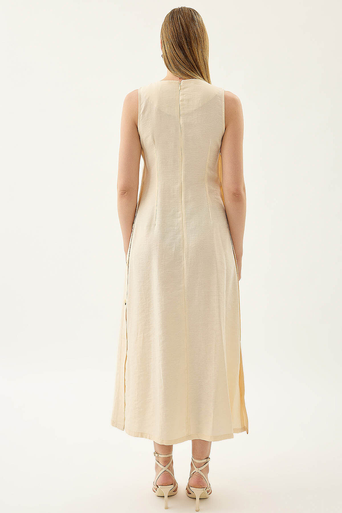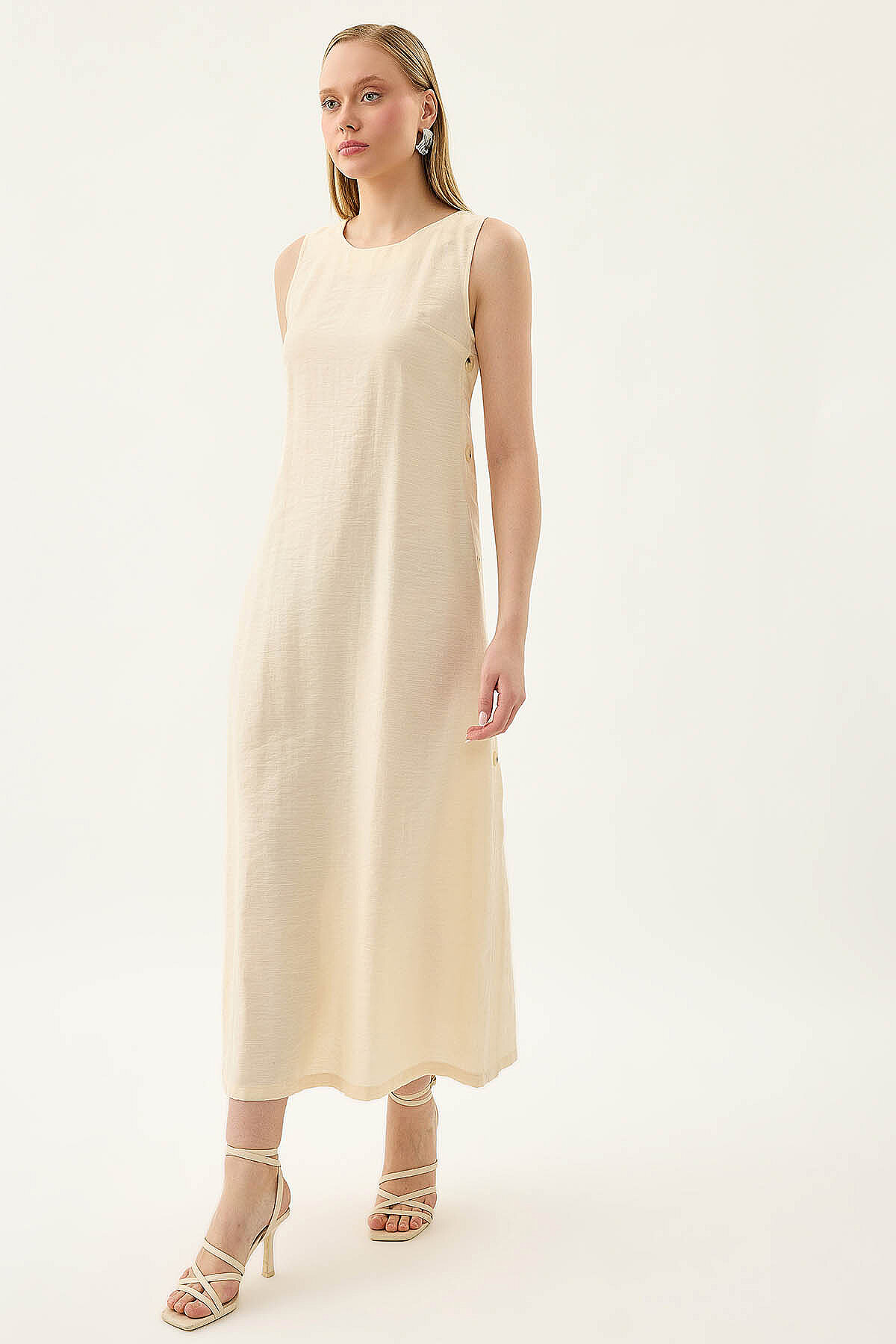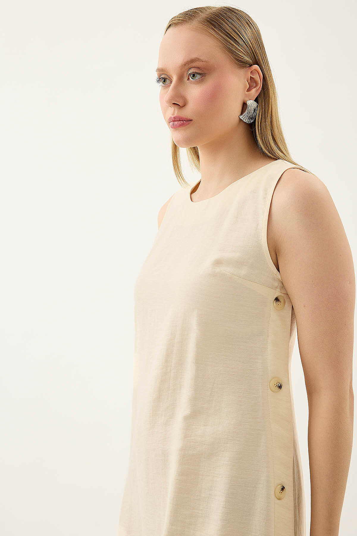 Yanları Düğmeli Sıfır Kol Elbise Krem