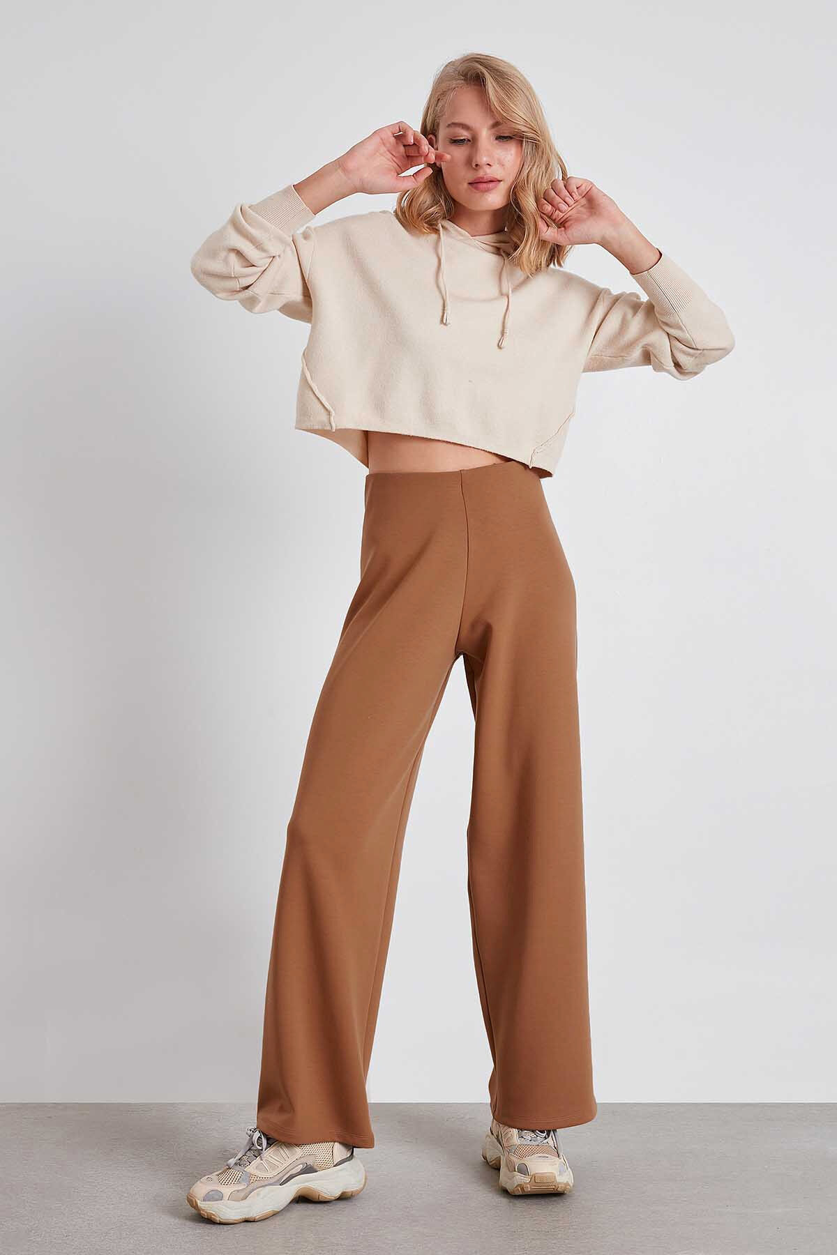 Yüksek Bel Bol Paça Örme Pantolon Deve Tüyü