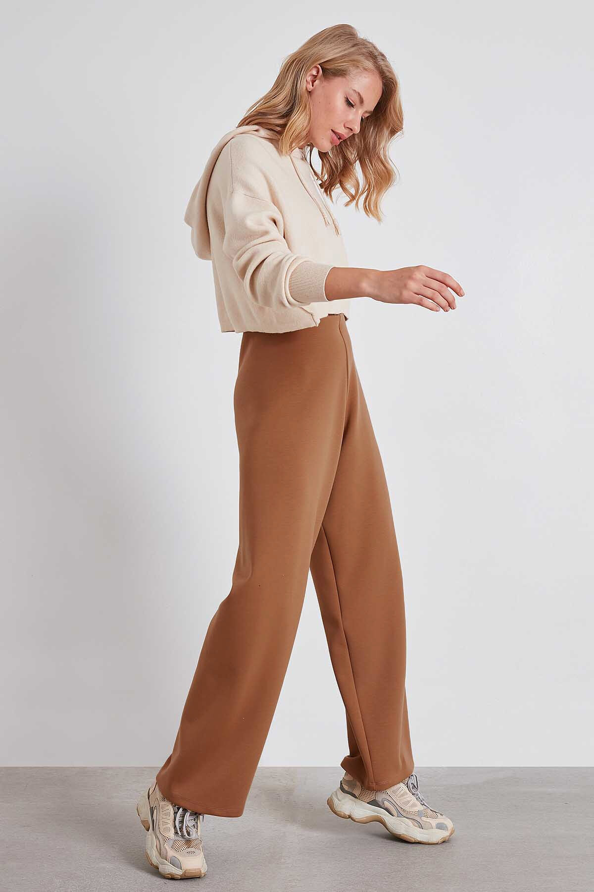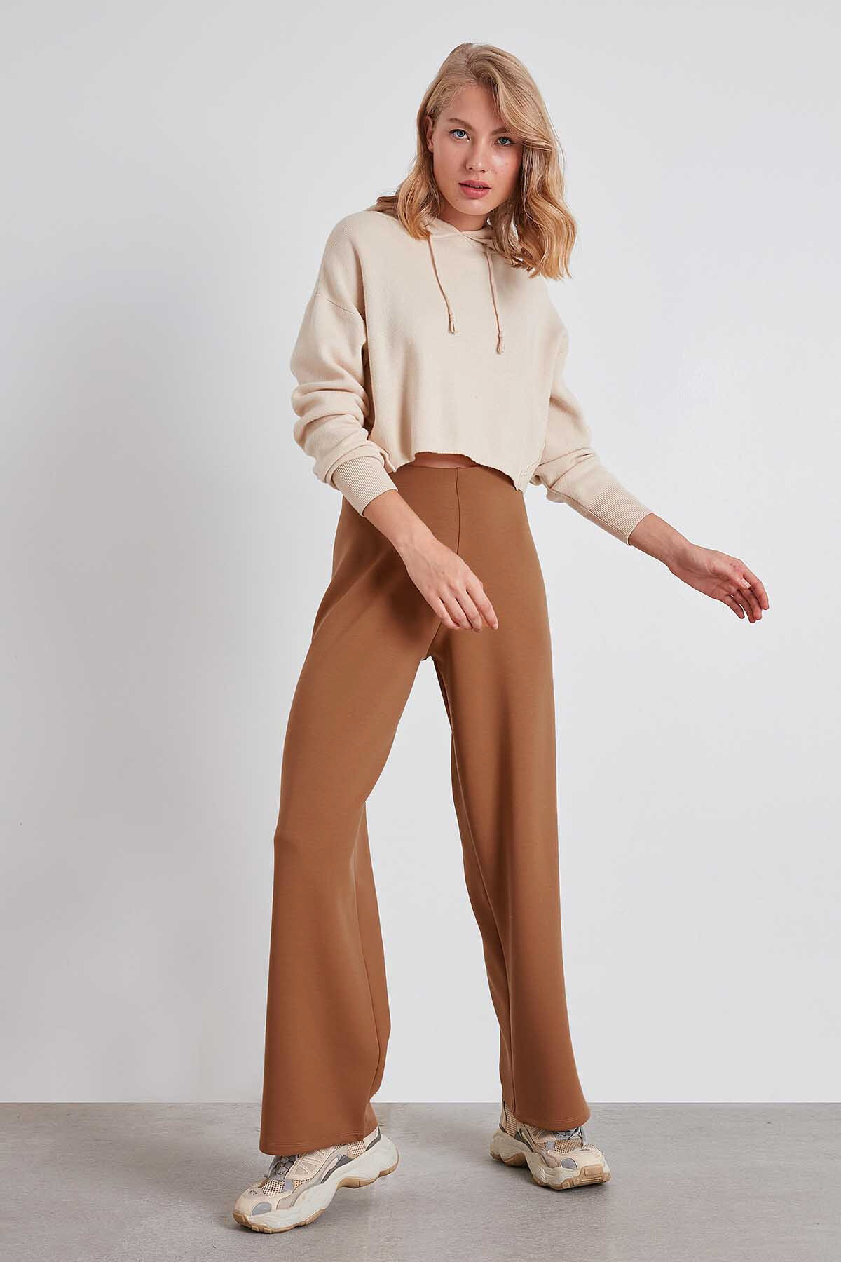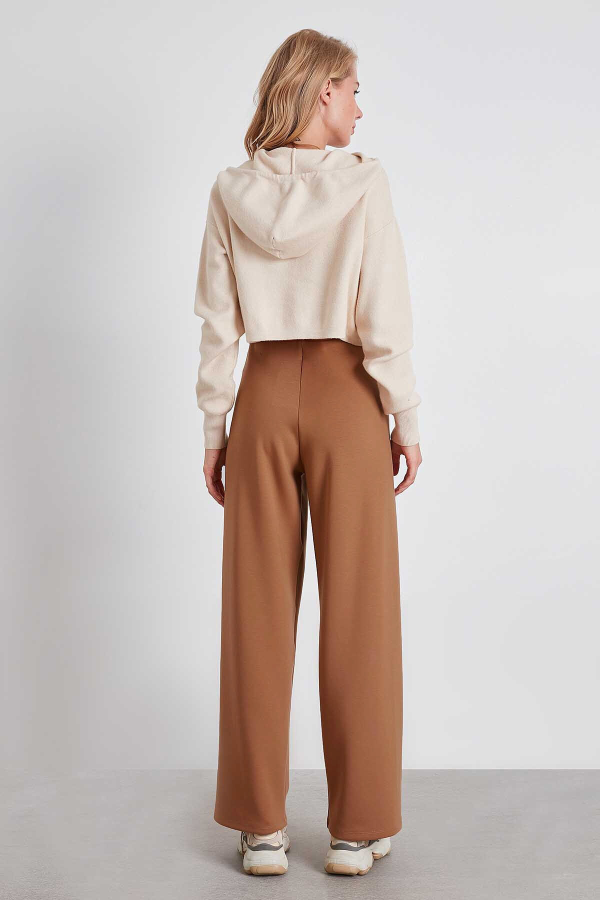 Yüksek Bel Bol Paça Örme Pantolon Kahve