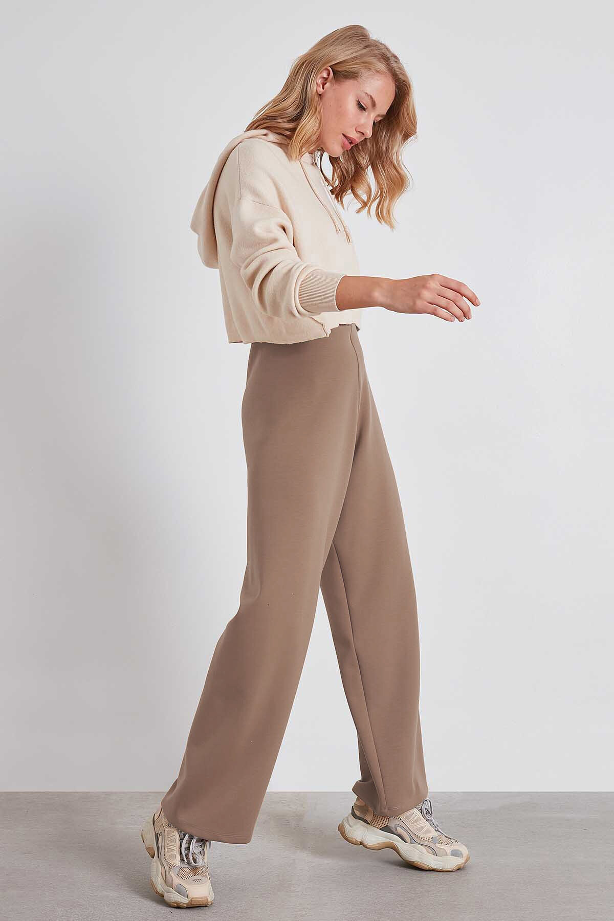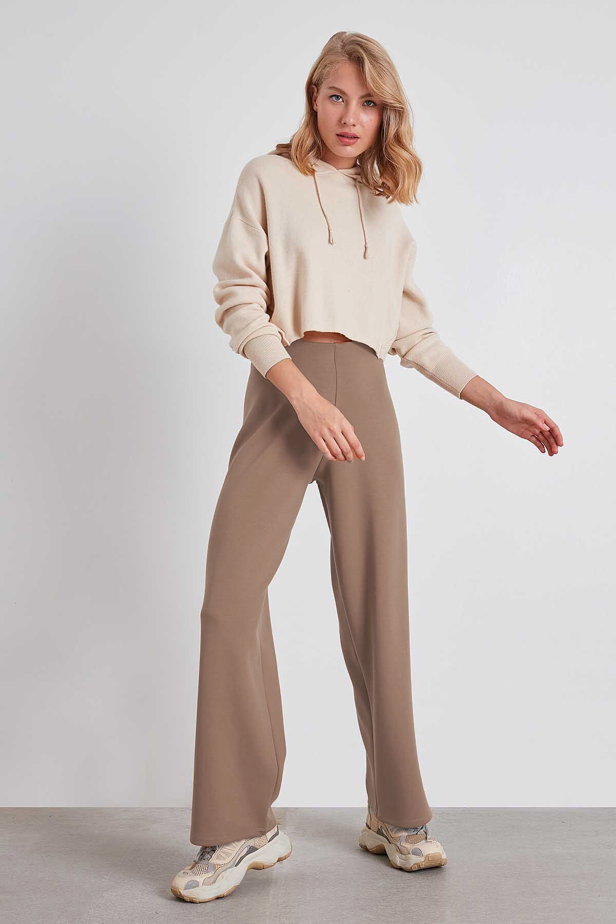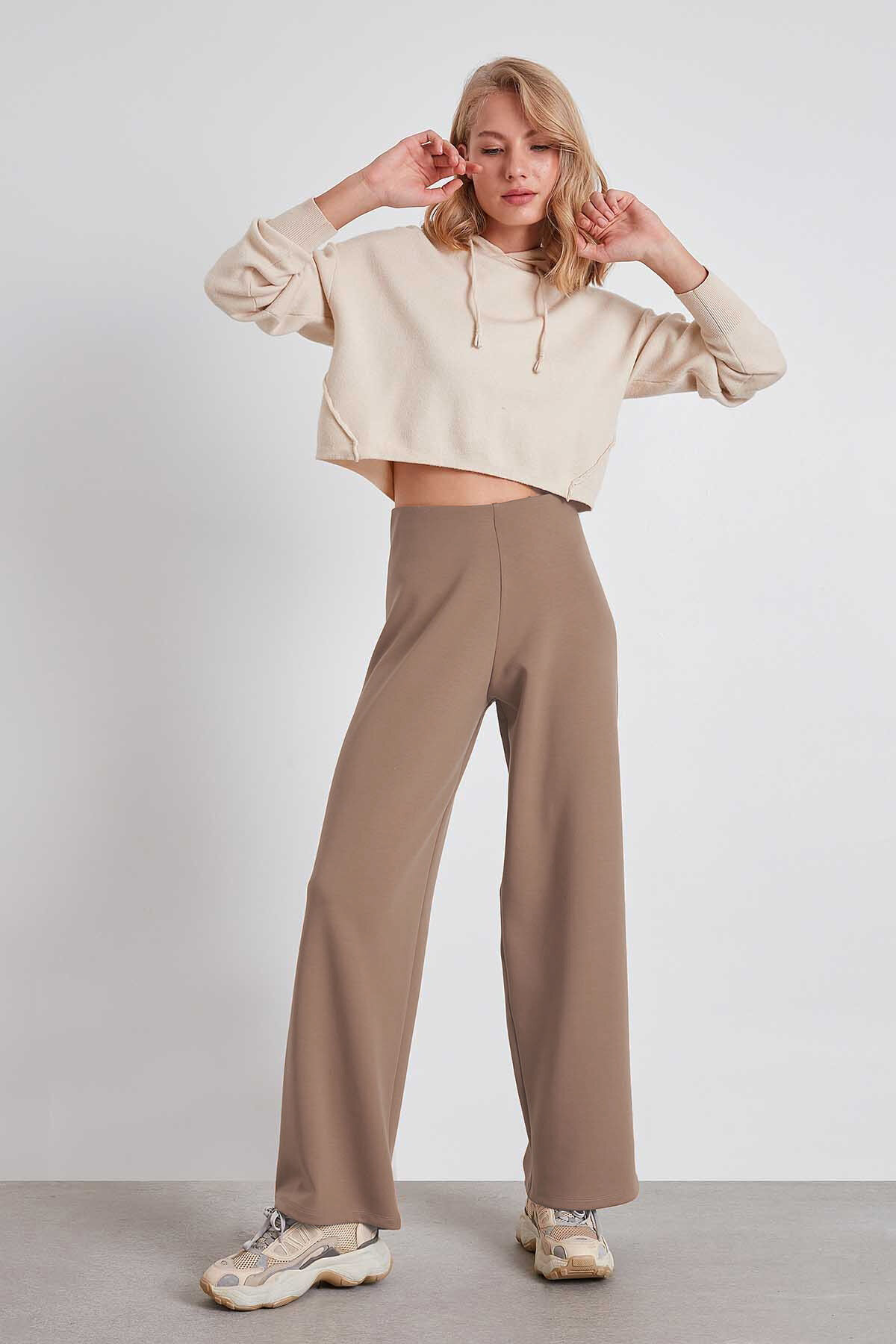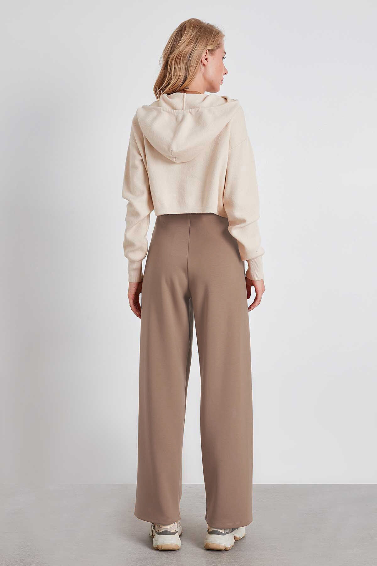 Yüksek Bel Bol Paça Örme Pantolon Vizon