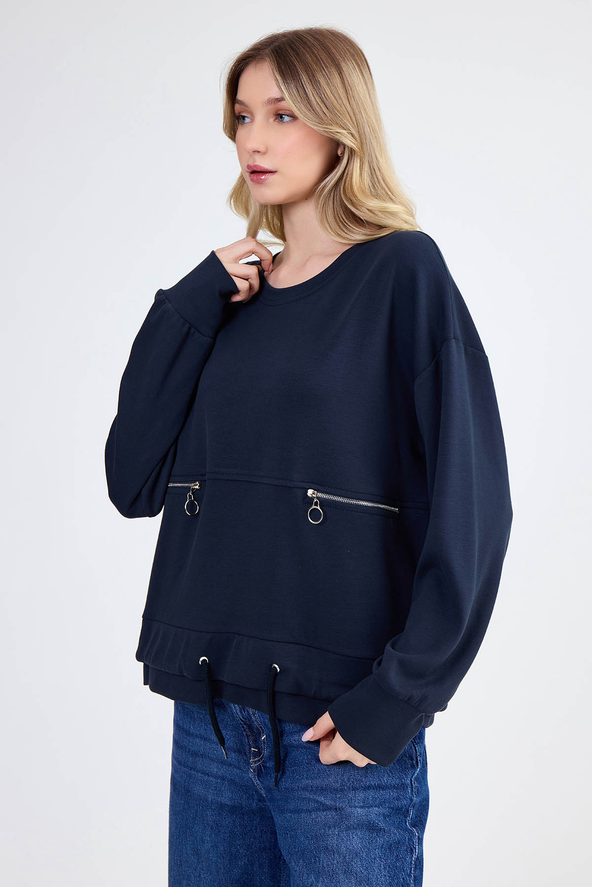 Yuvarlak Yaka Beli Bağcıklı Fermuar Detaylı Bluz