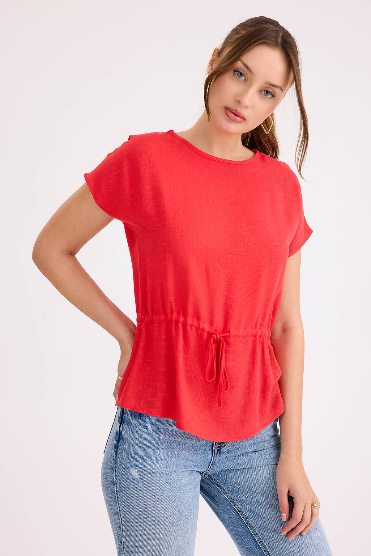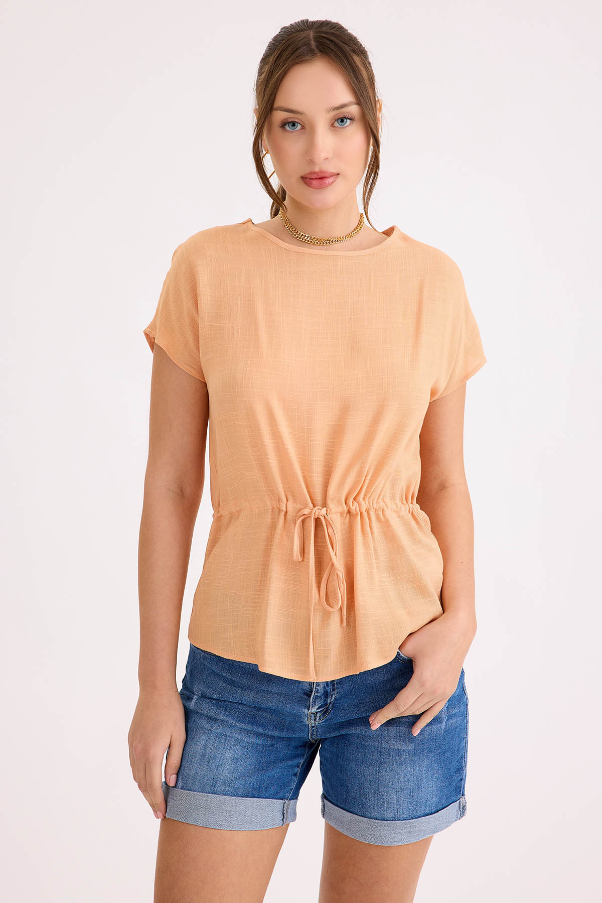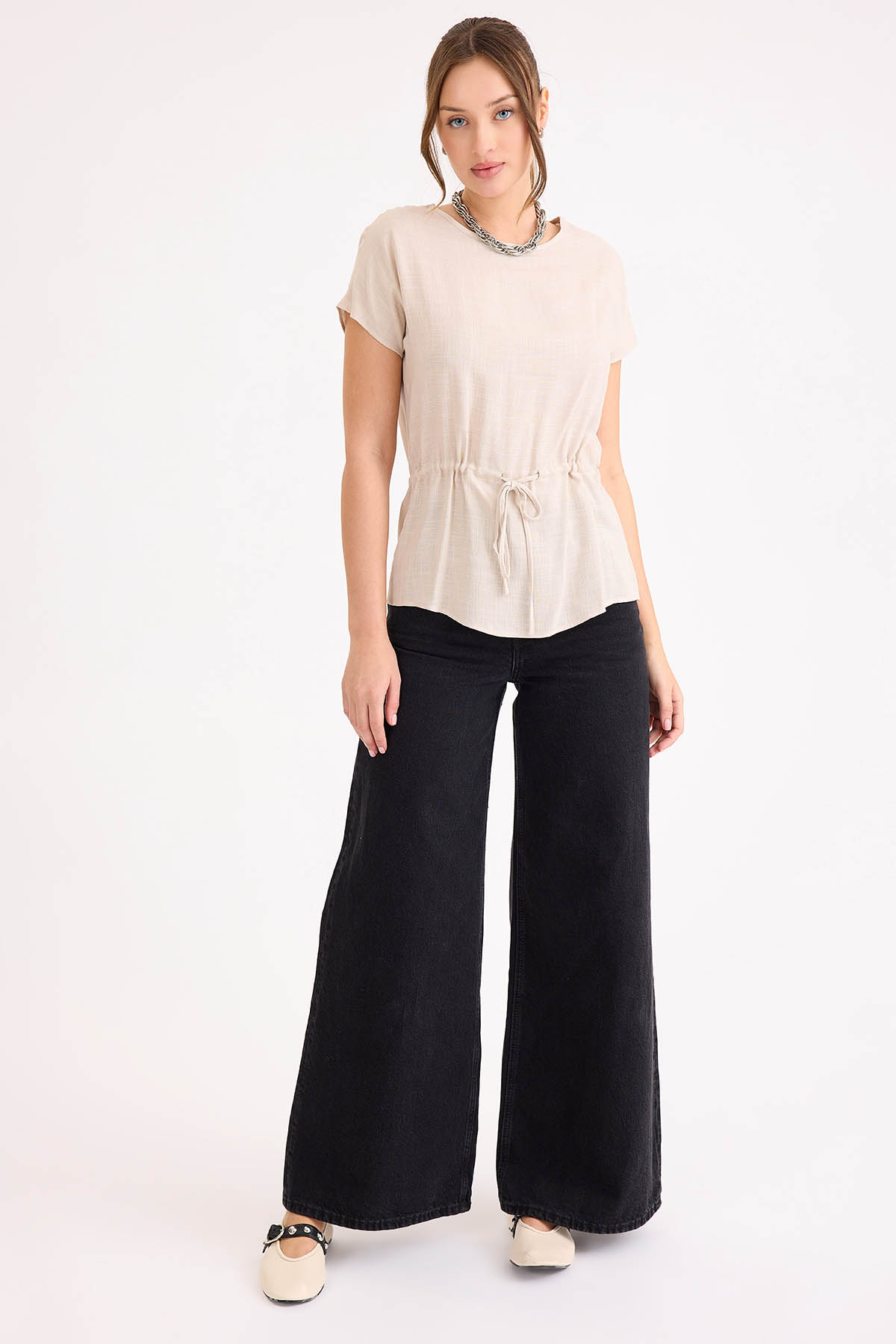 Yuvarlak Yaka Beli Büzgülü Keten Bluz