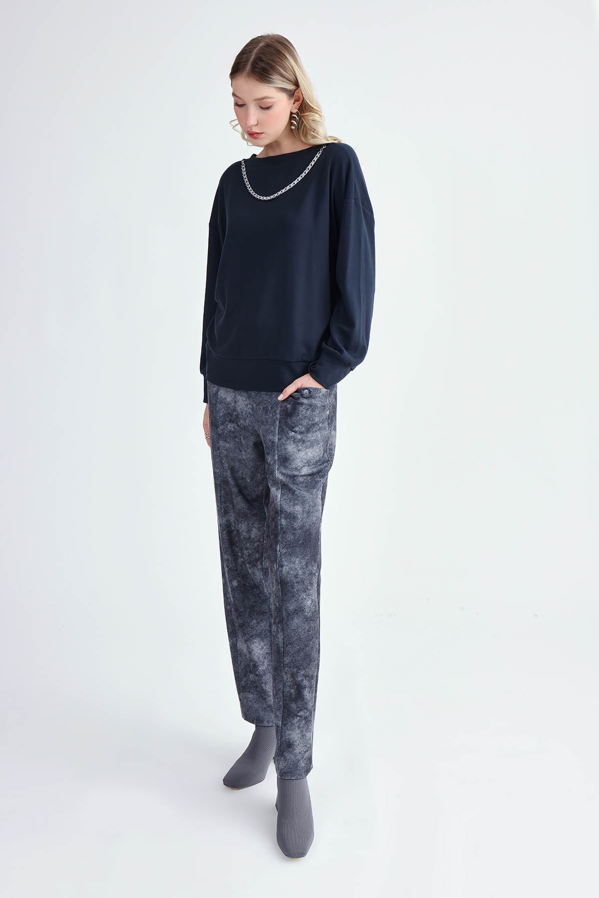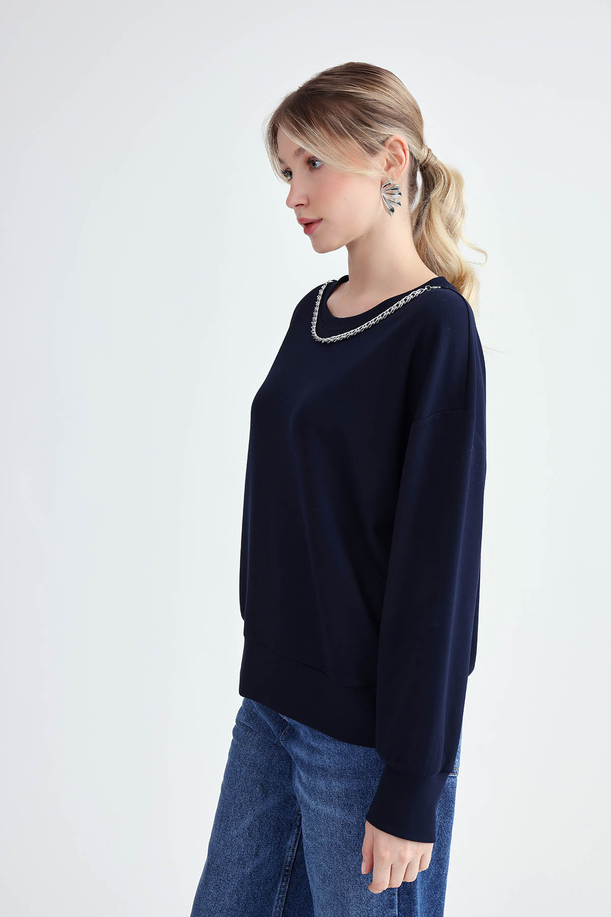Yuvarlak Yaka Önü Zincir Detaylı Uzun Kol Bluz