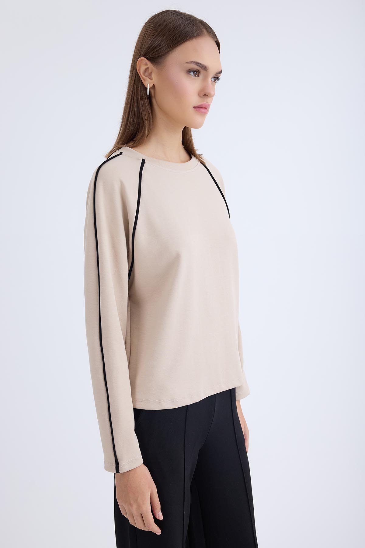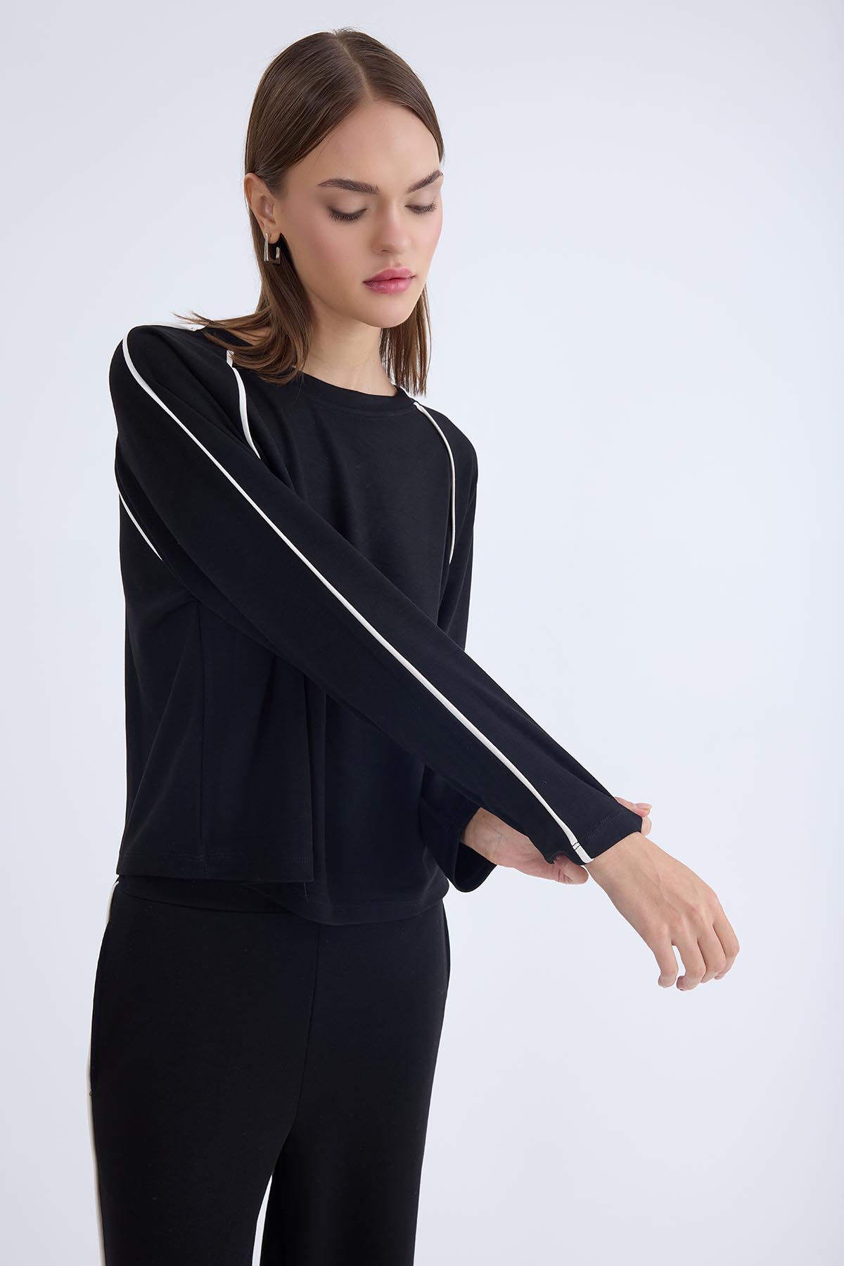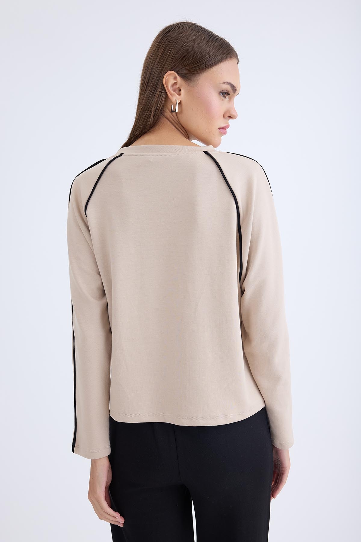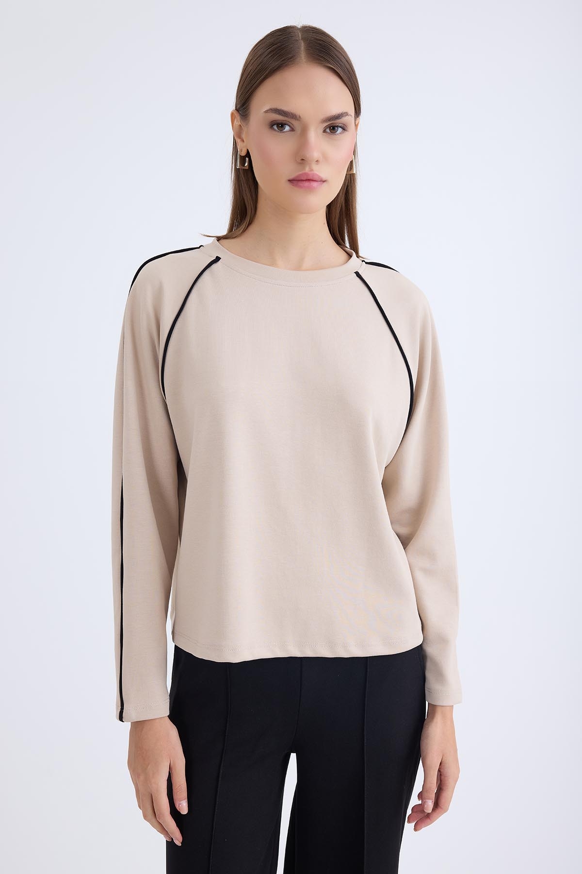 Yuvarlak Yaka Şeritli Uzun Kol Bluz
