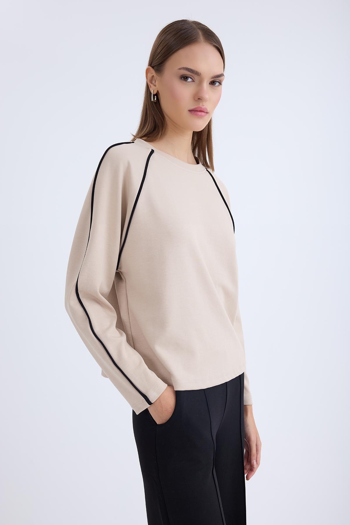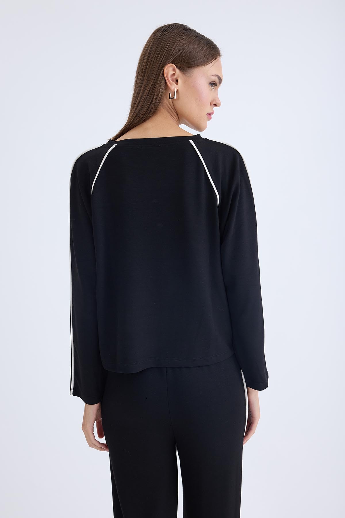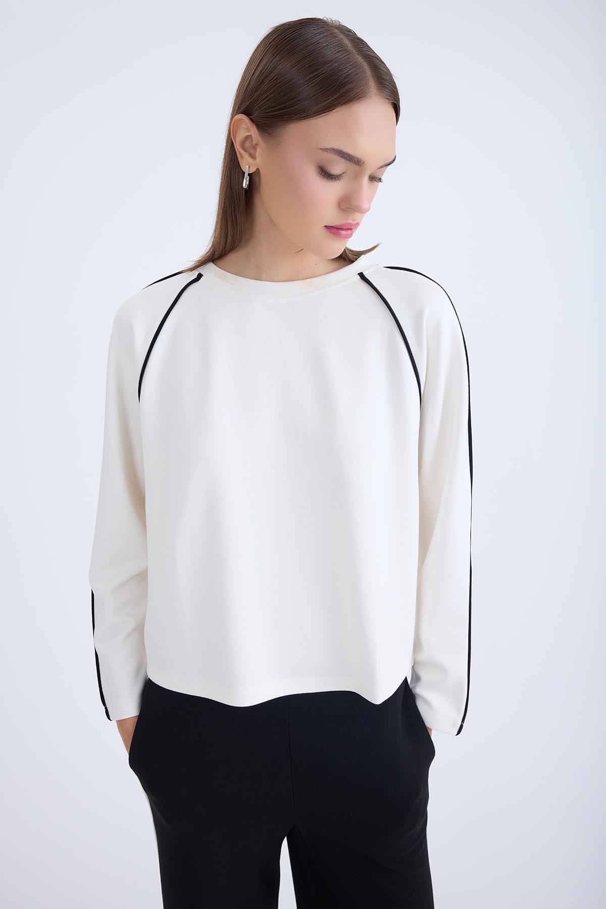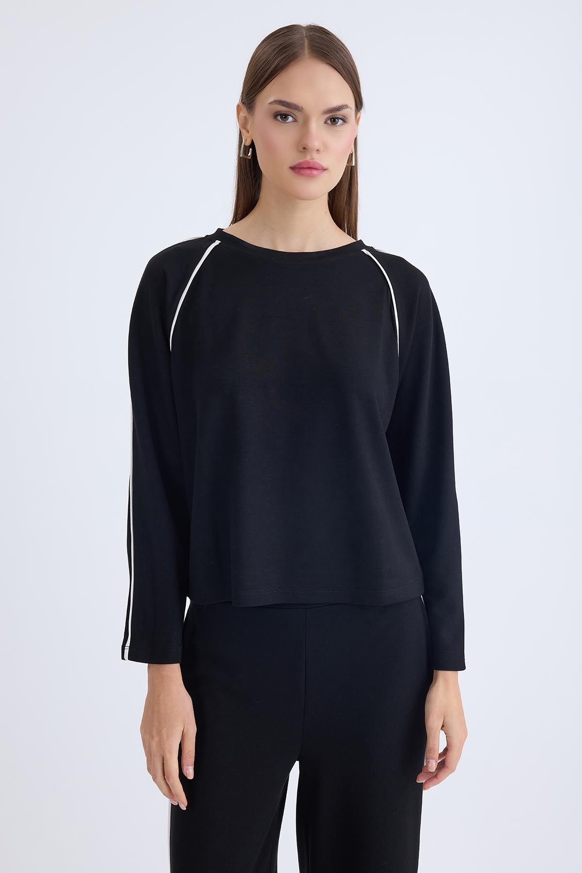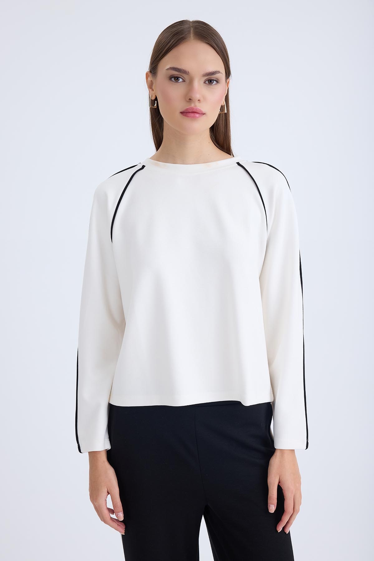 Yuvarlak Yaka Şeritli Uzun Kol Bluz