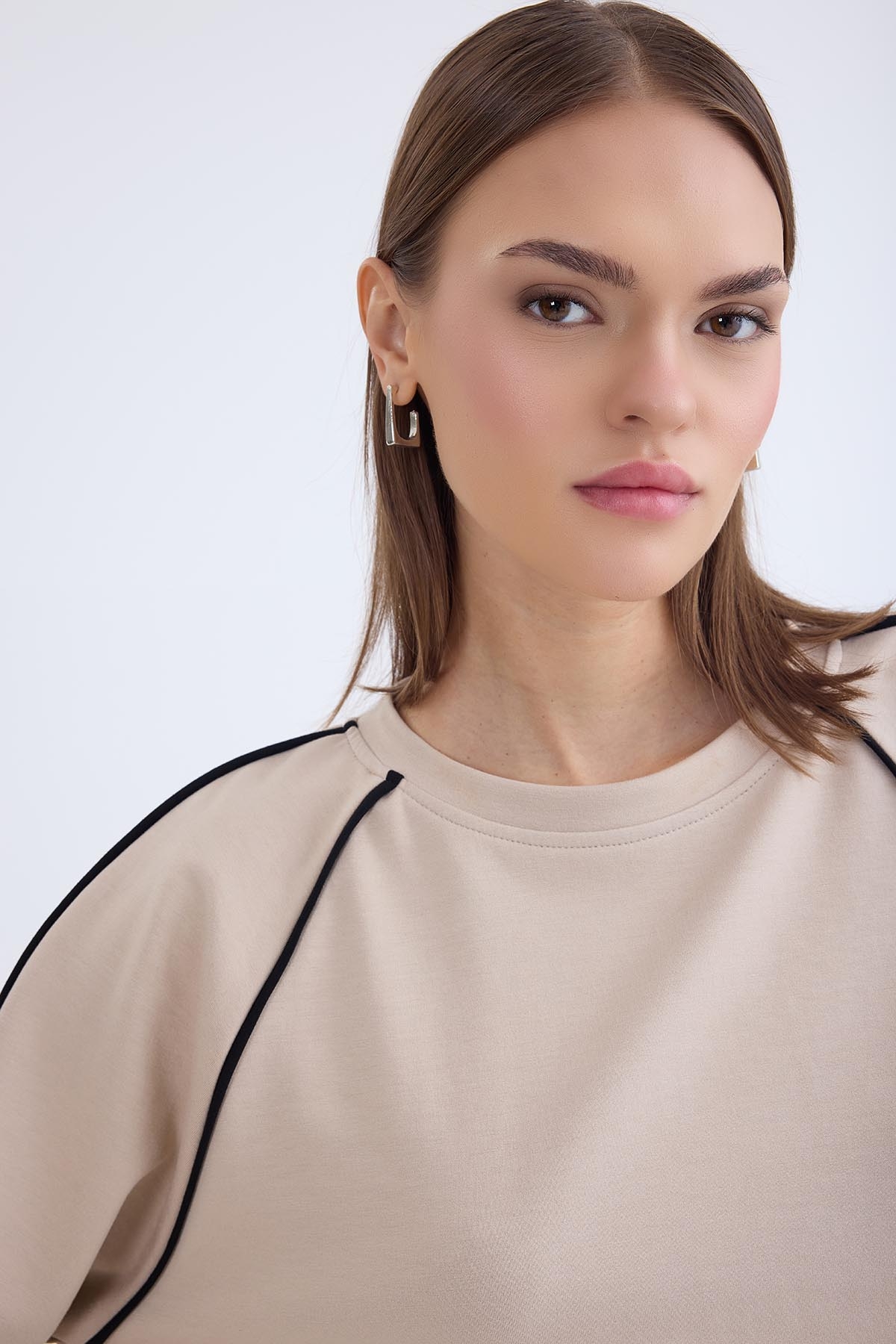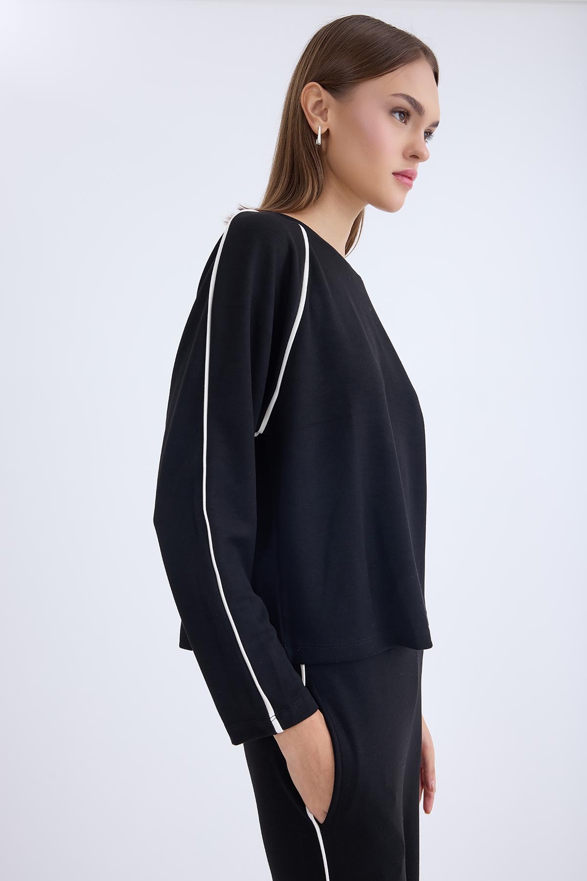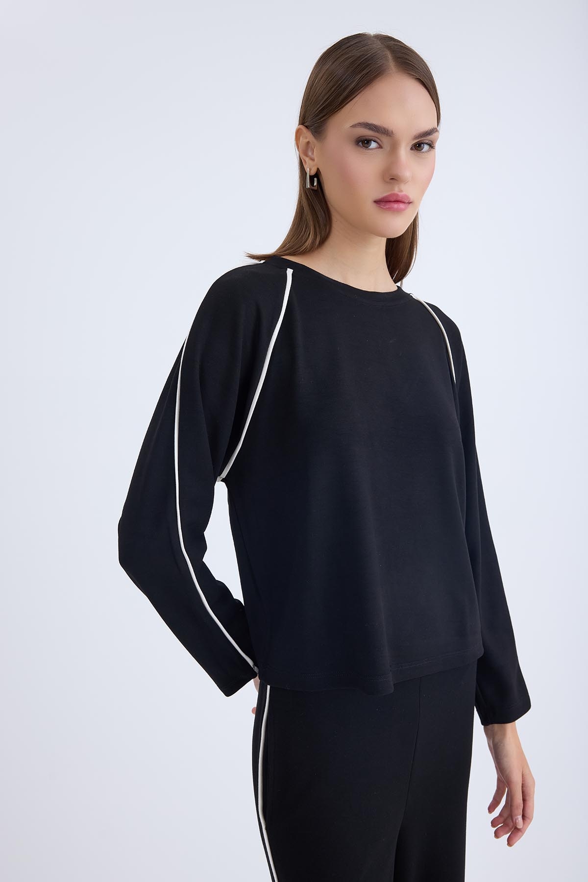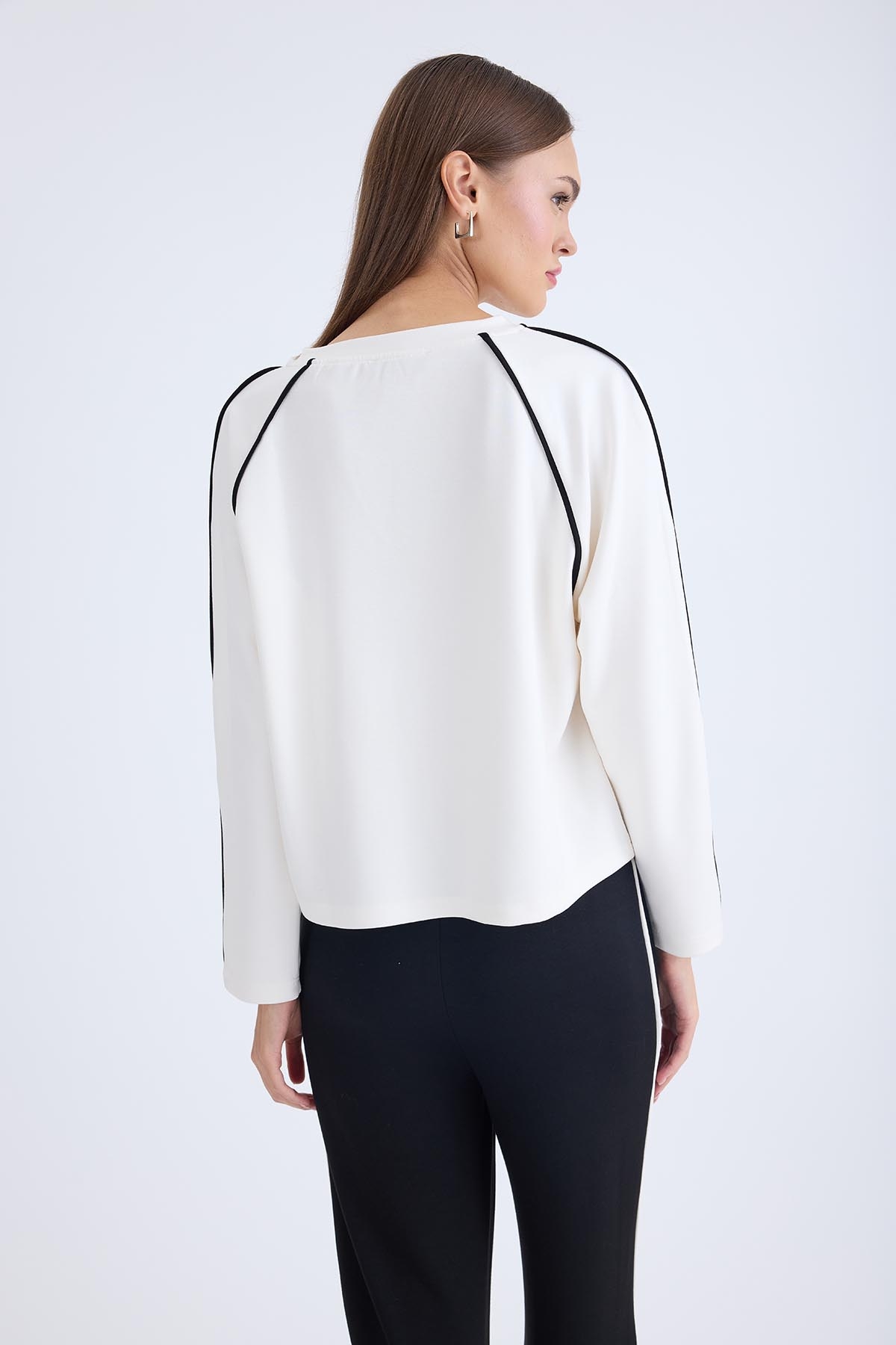 Yuvarlak Yaka Şeritli Uzun Kol Bluz